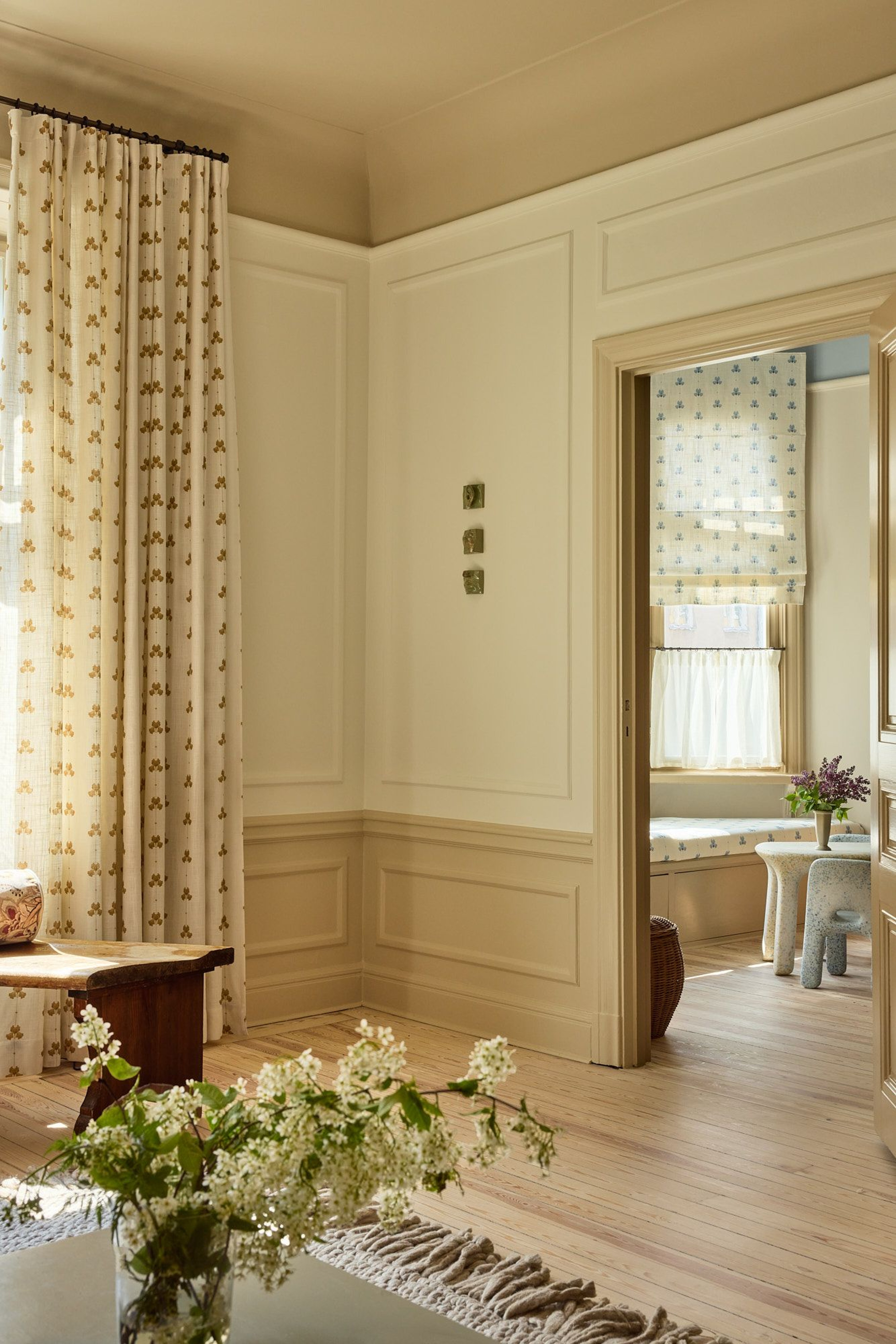 “The apartment has beautiful old stucco and wall paneling that we wanted to highlight, using slightly contrasting but still neutral tones. My husband especially wanted more color this time around, so we decided to paint the ceiling in the kids’ room blue – and we were so happy when, during our planning with you at Gotain, we found the perfect blue floral print that matched our palette.”