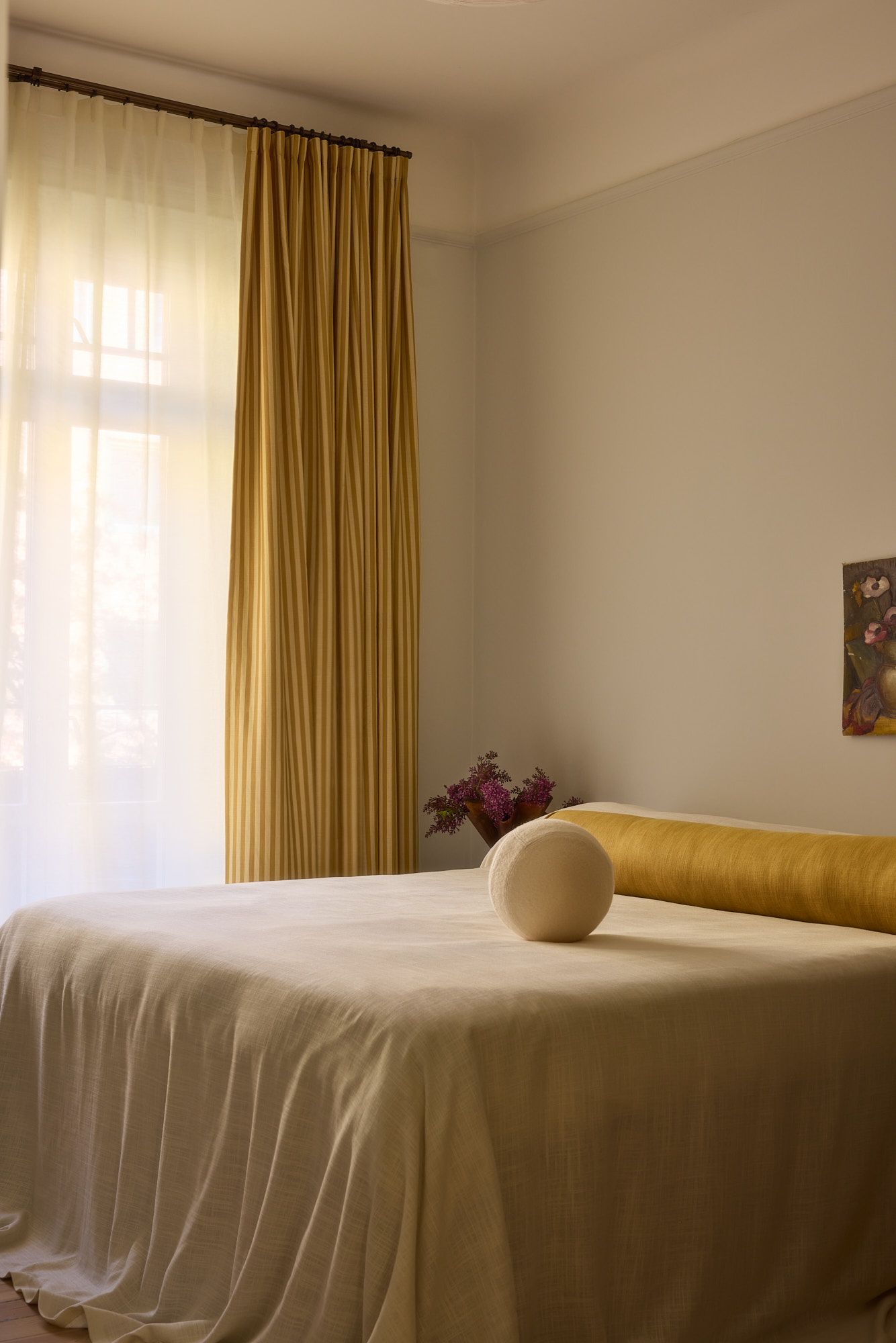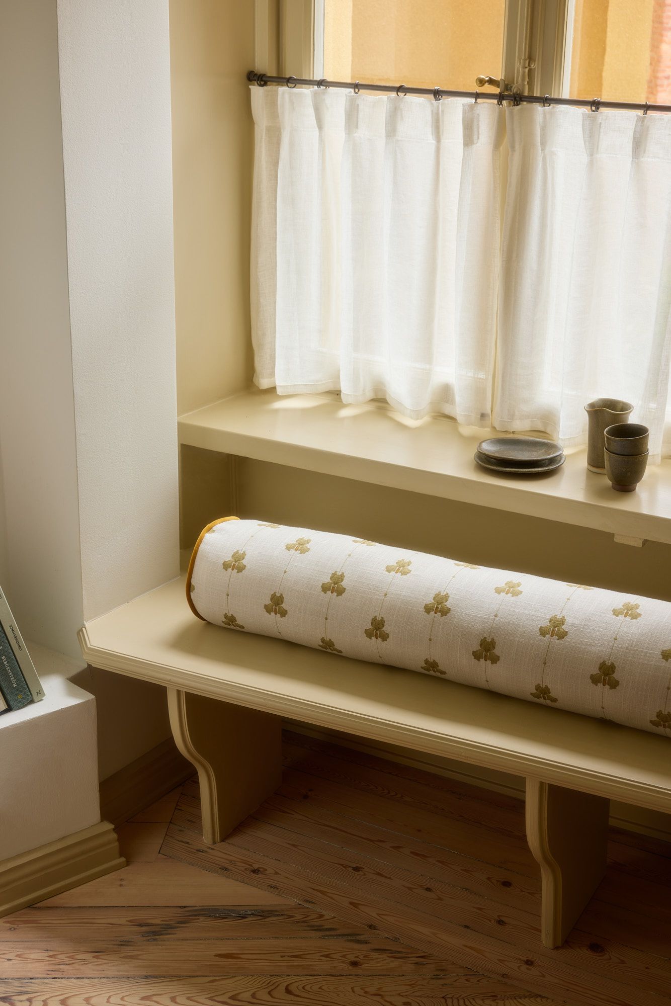 Hanne’s love for color appears here too. In a room where many would have gone for a plain curtain to blend in, she chose Cottage Stripe in mustard – a bold choice that adds a playful and unexpected contrast to the otherwise pared-back aesthetic. The narrow stripes energize the room and break up the clean lines in a way that feels both thoughtful and lighthearted.