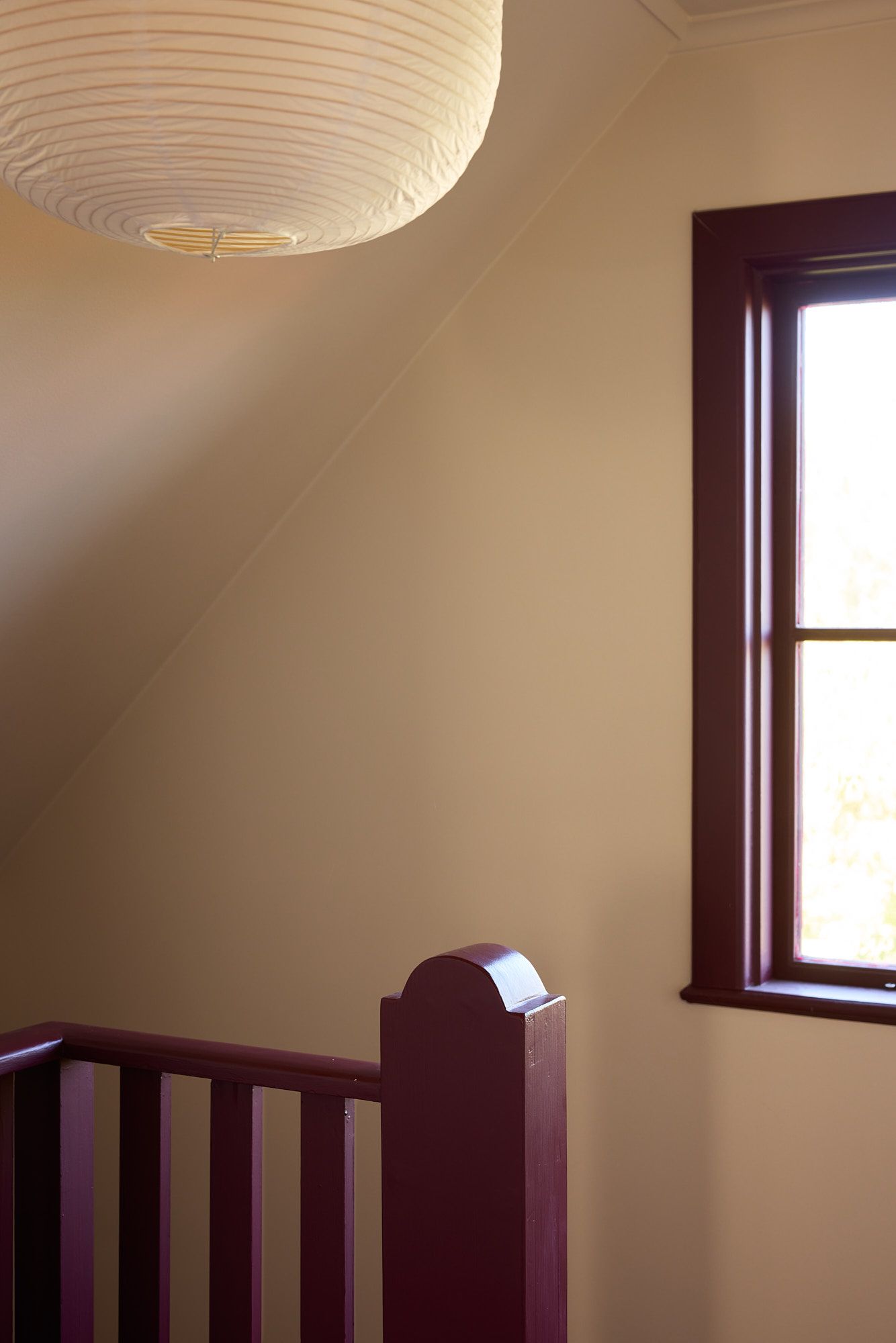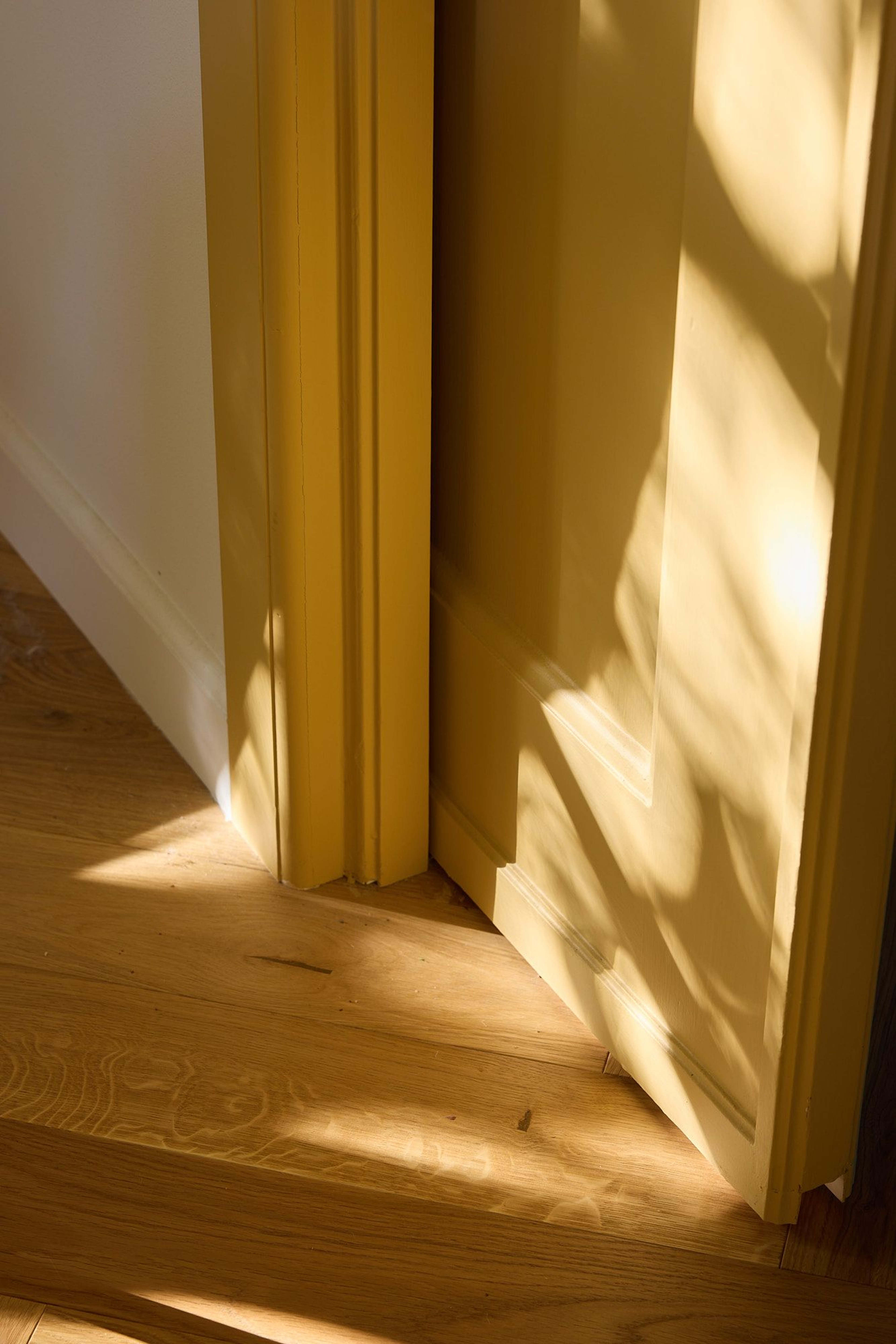 The yellow tones from the lower floor reappear here, with trim details painted in a citrusy shade that both complements and contrasts with the yellow walls. The curtains, elegantly draped with black tiebacks, bring weight to the space and create an almost regal look. Asian influences add a unique touch to the room, with a beautifully crafted rattan chair, a rice paper ceiling lamp that casts a soft light, and a small tassel discreetly hanging from the door handle. On the floor stands a vintage sewing box Julia sourced, serving as both decor and functional storage.