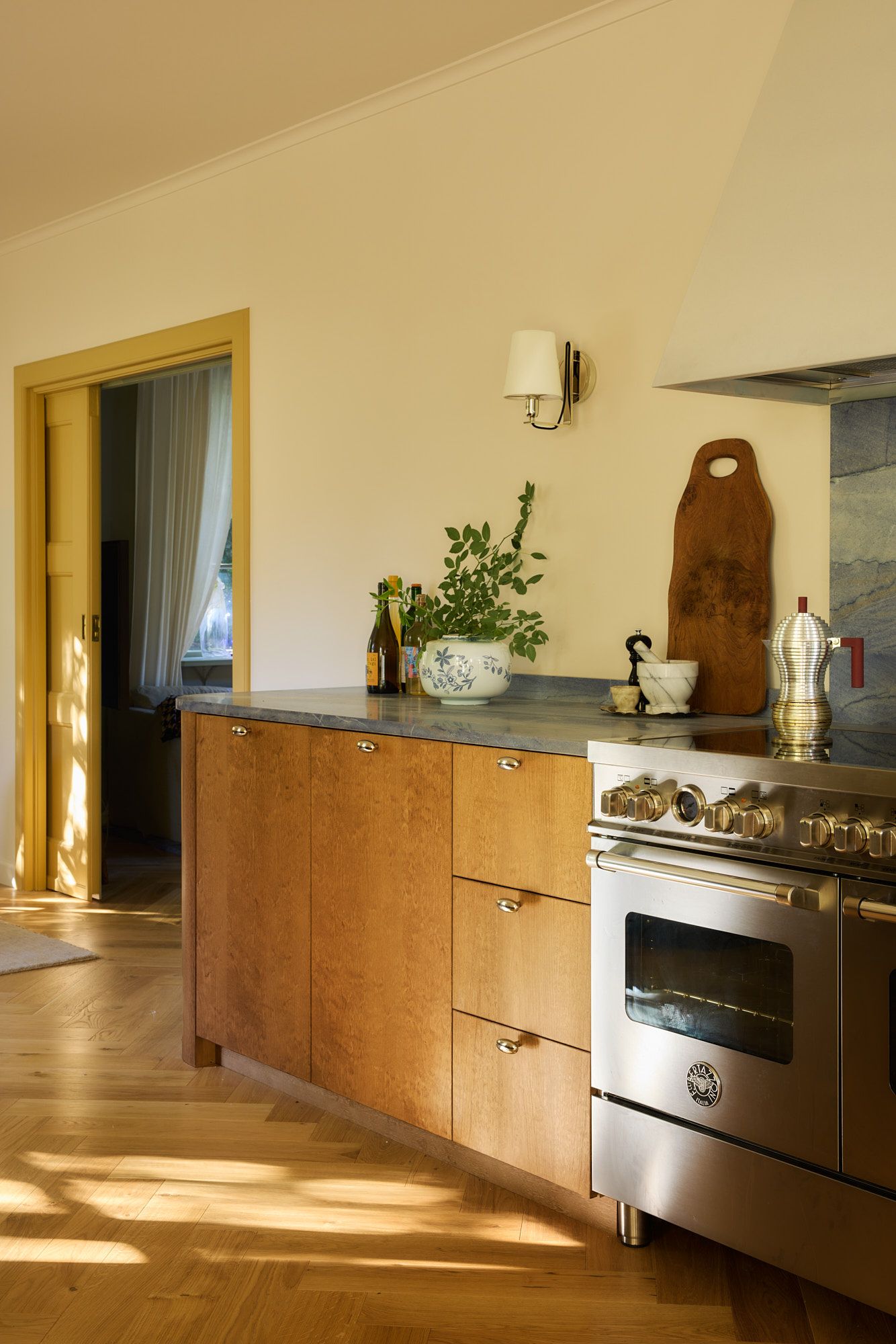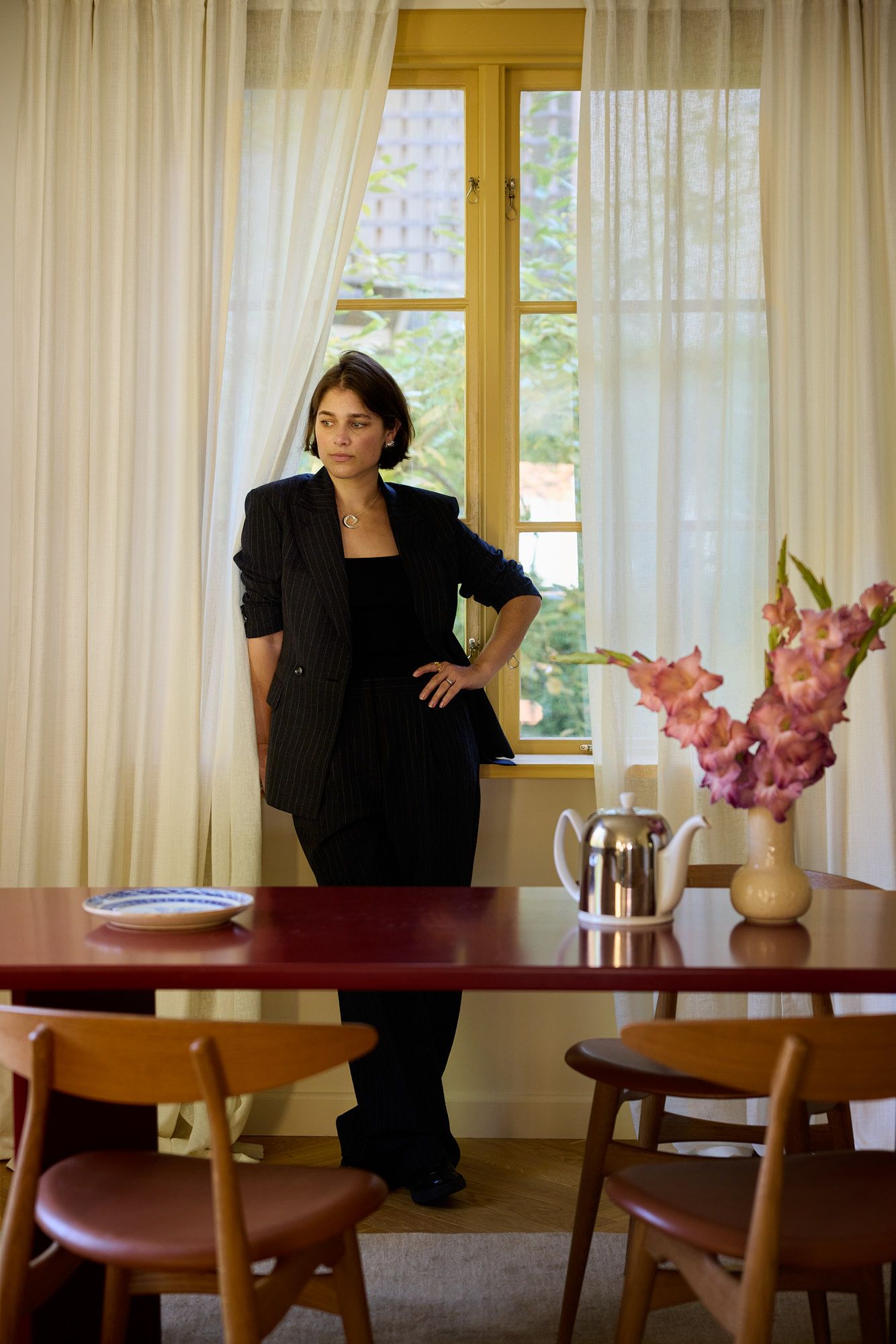 For Julia, textiles have been as important as any other material choice in the kitchen. Strong colors are balanced by neutral curtains in soft off-white tones. In the kitchen’s cooking area, she’s chosen a Roman shade in a woven linen, while in the social dining area, the same textile reappears as full-length curtains. To create a warm and inviting ambiance, Julia has layered curtains on black rods, adding a subtle yet impactful depth to the space. The woven off-white linen is paired with sheer linen curtains in the same hue, and a gentle drape grounds the look, adding sophistication. The red accents in the built-in bench are echoed in the dining table, also custom-designed by Julia, surrounded by warm-toned wooden chairs.