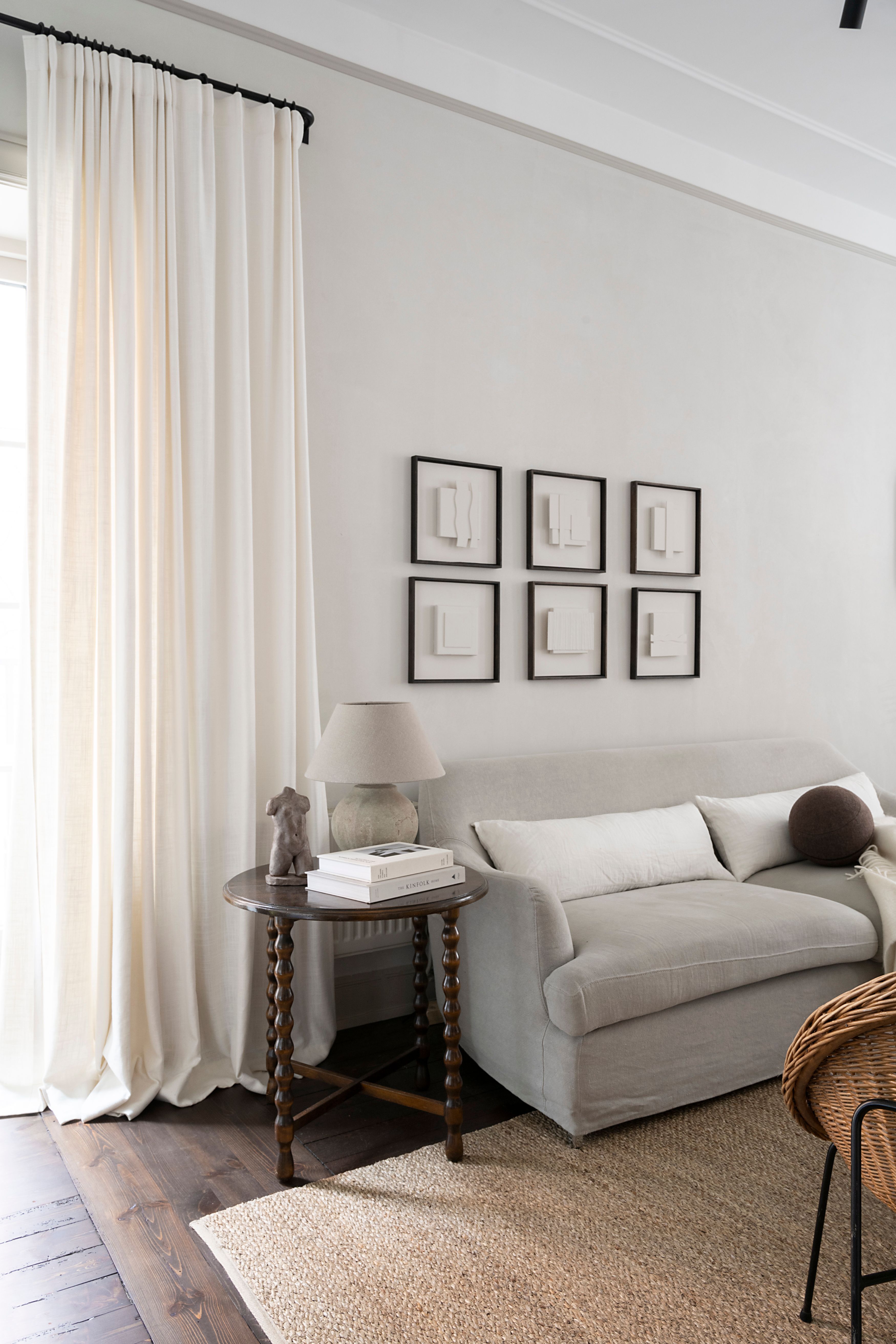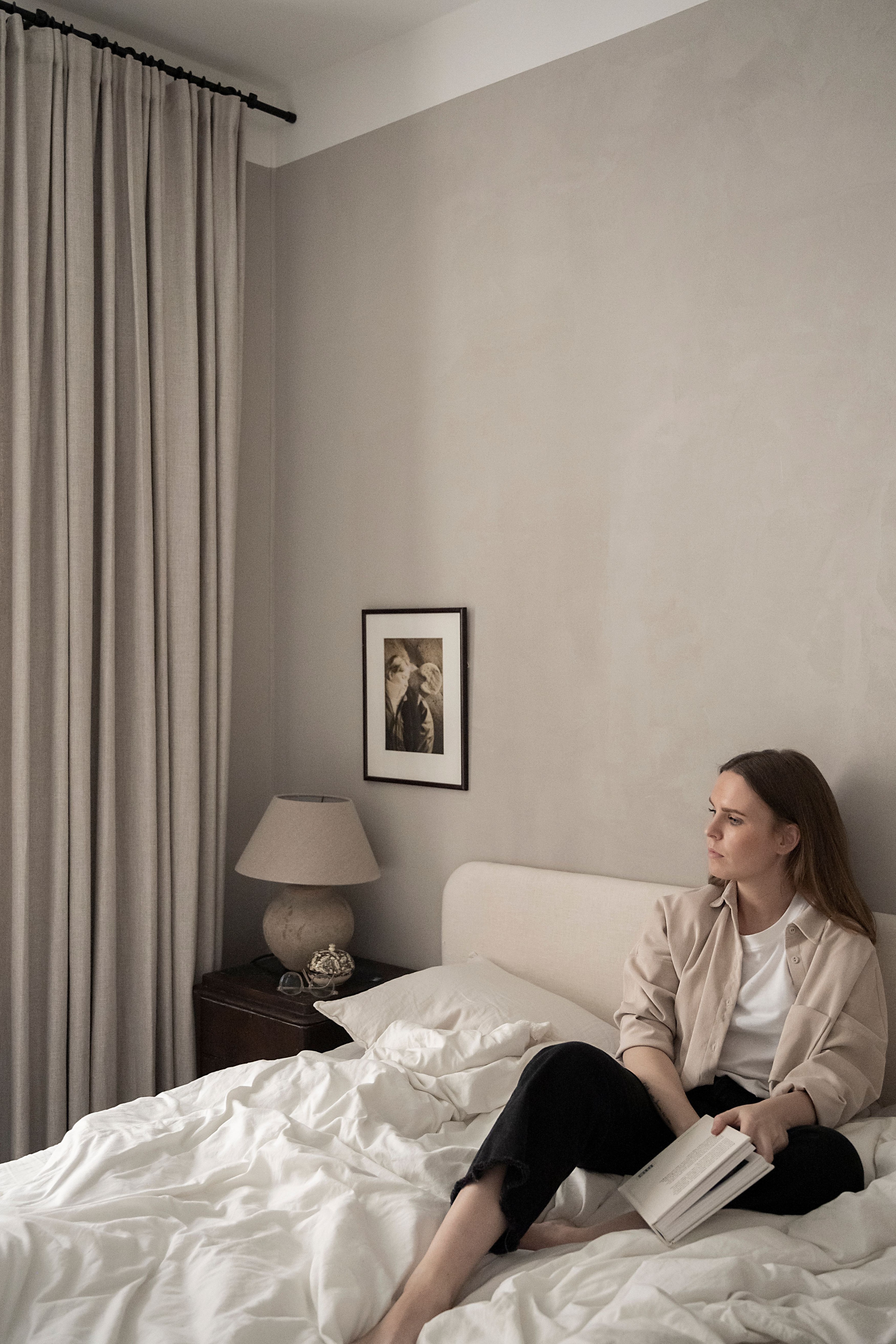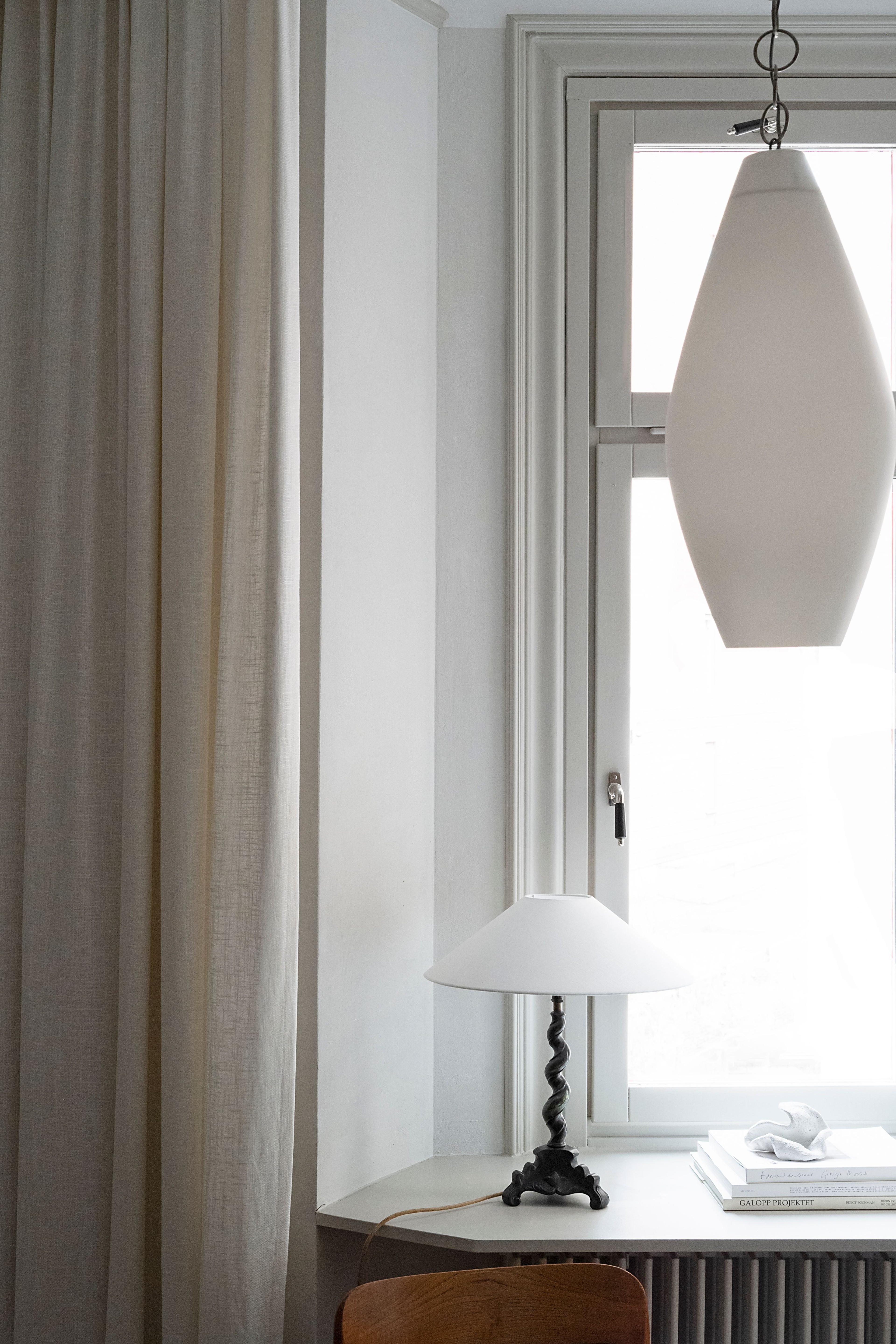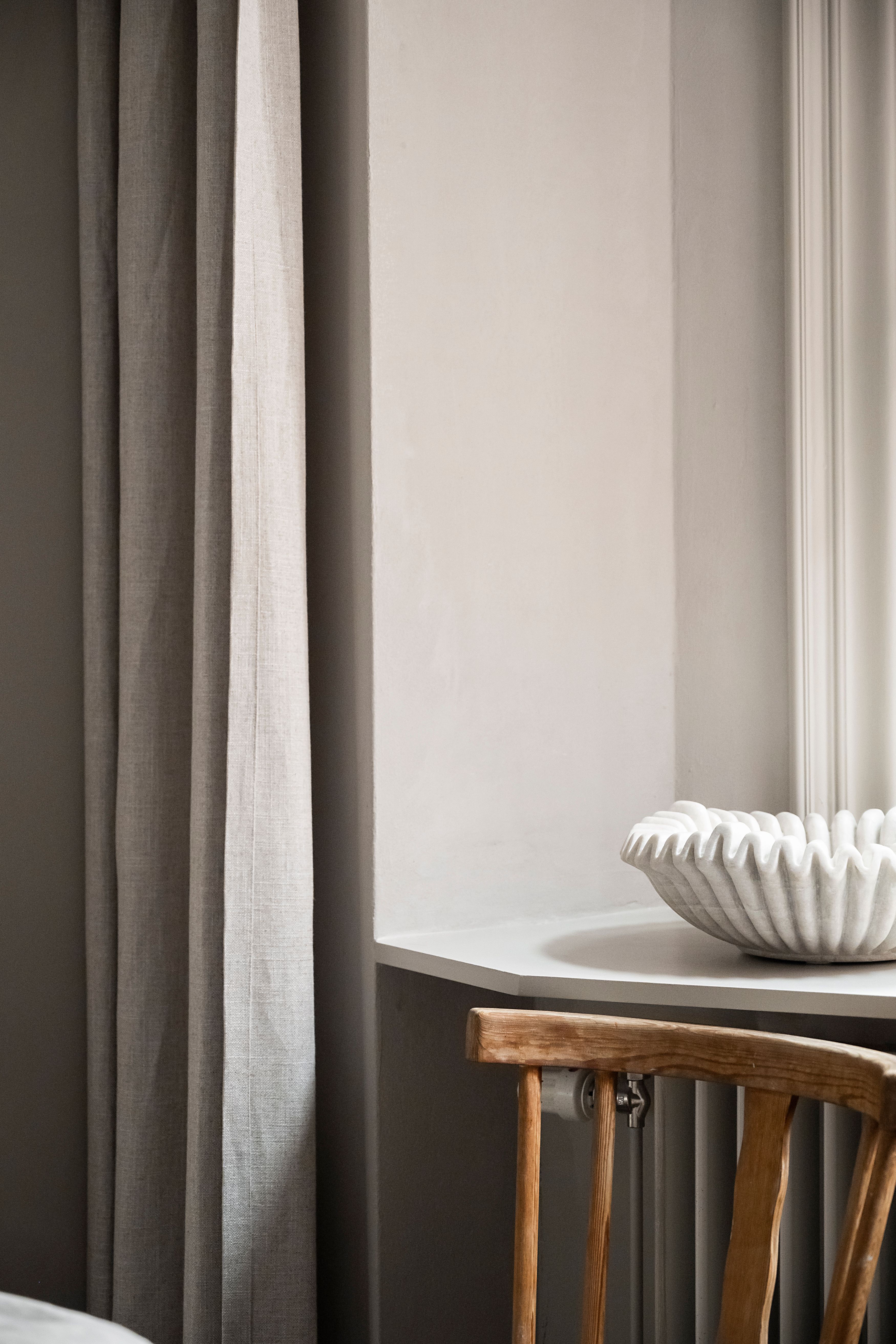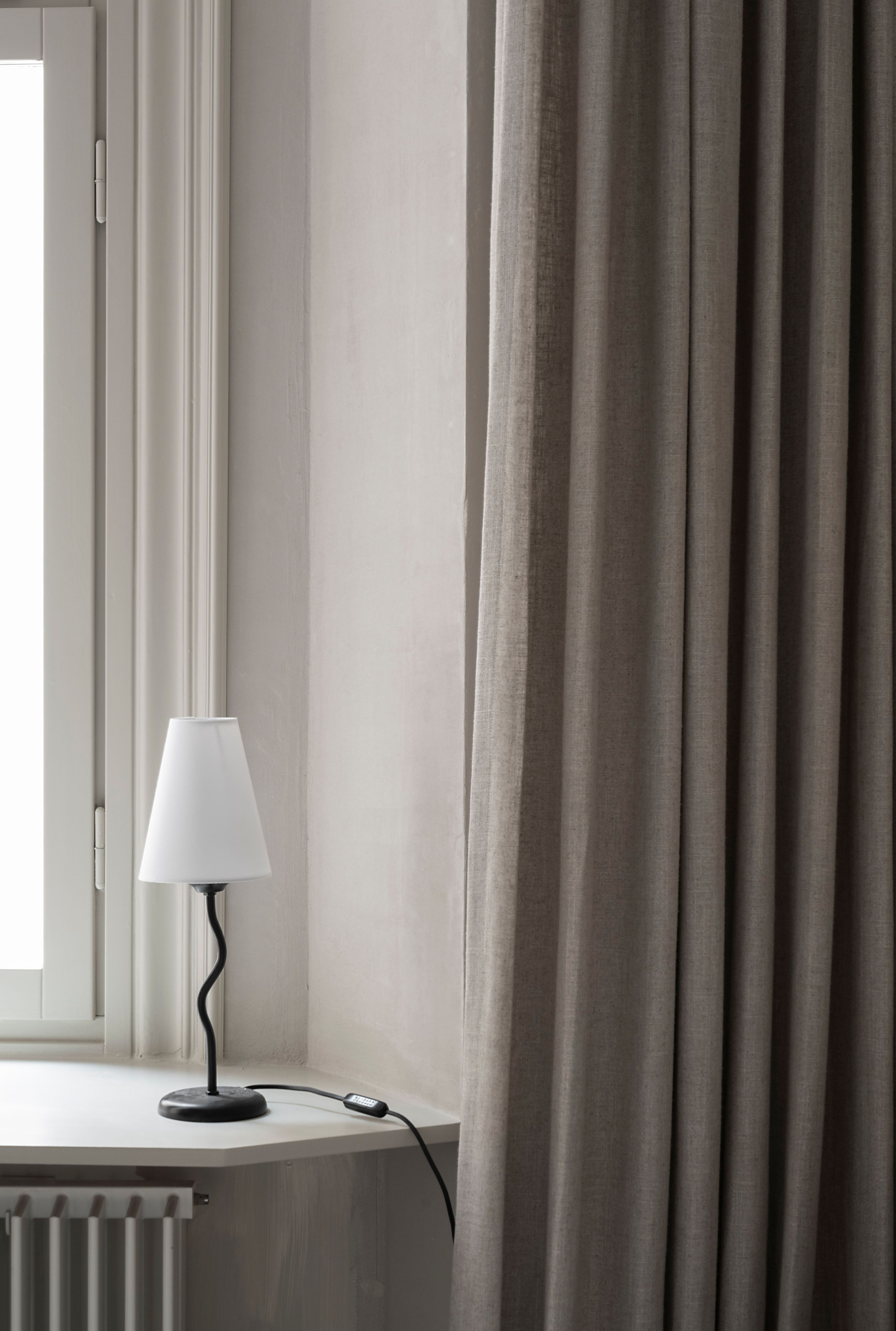 To complement the rustic walls, Lovisa has consistently chosen woven linen curtains, but in different tones in the different rooms. In the living room and office, woven linen curtains hang in off-white, while the bedroom, with its slightly darker and warmer color, the color sand drapes the window. In all rooms, the curtains are mainly decorative, and hang parked at the sides of the bay windows in black curtain rods. Lovisa says that the textile feel was the most important thing in the choice of curtains and suspension, rather than the function of being able to pull them back and forth.