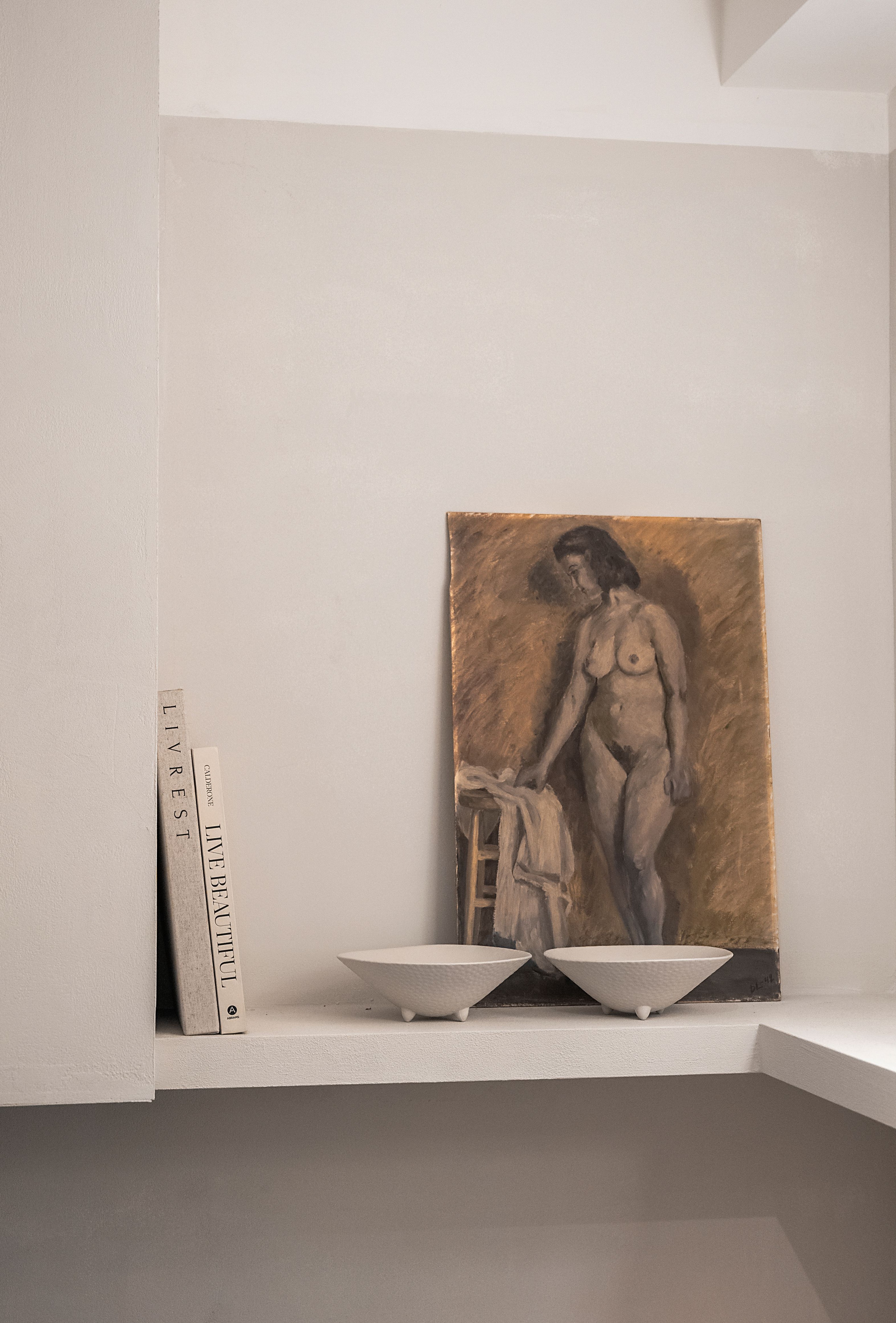 The walls in the entire apartment are painted in plaster paint which gives an uneven and structured surface, and the kitchen is no exception. The whitewashed walls give an almost rustic feeling, which is met by the more modern, boldly patterned marble worktop, something that we understand has been a theme throughout the interior. Smooth materials that meet structured, patterns meets solid color, rustic that meets elegant and new that meets old, it is clear that Lovisa likes to mix. The latest purchase for the apartment is the painting that has been placed on a shelf in the kitchen, a picture of a woman in warm, orange tones, a catch caught on auction in the autumn.