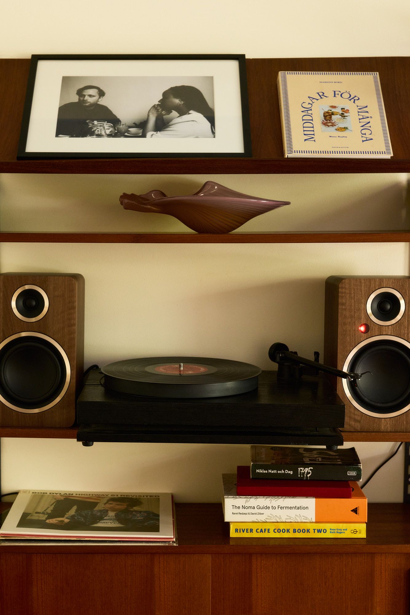 Among the details Marion holds particularly dear is the teak shelf housing the family’s record player, a slice of everyday life framed by wood, music and memories.