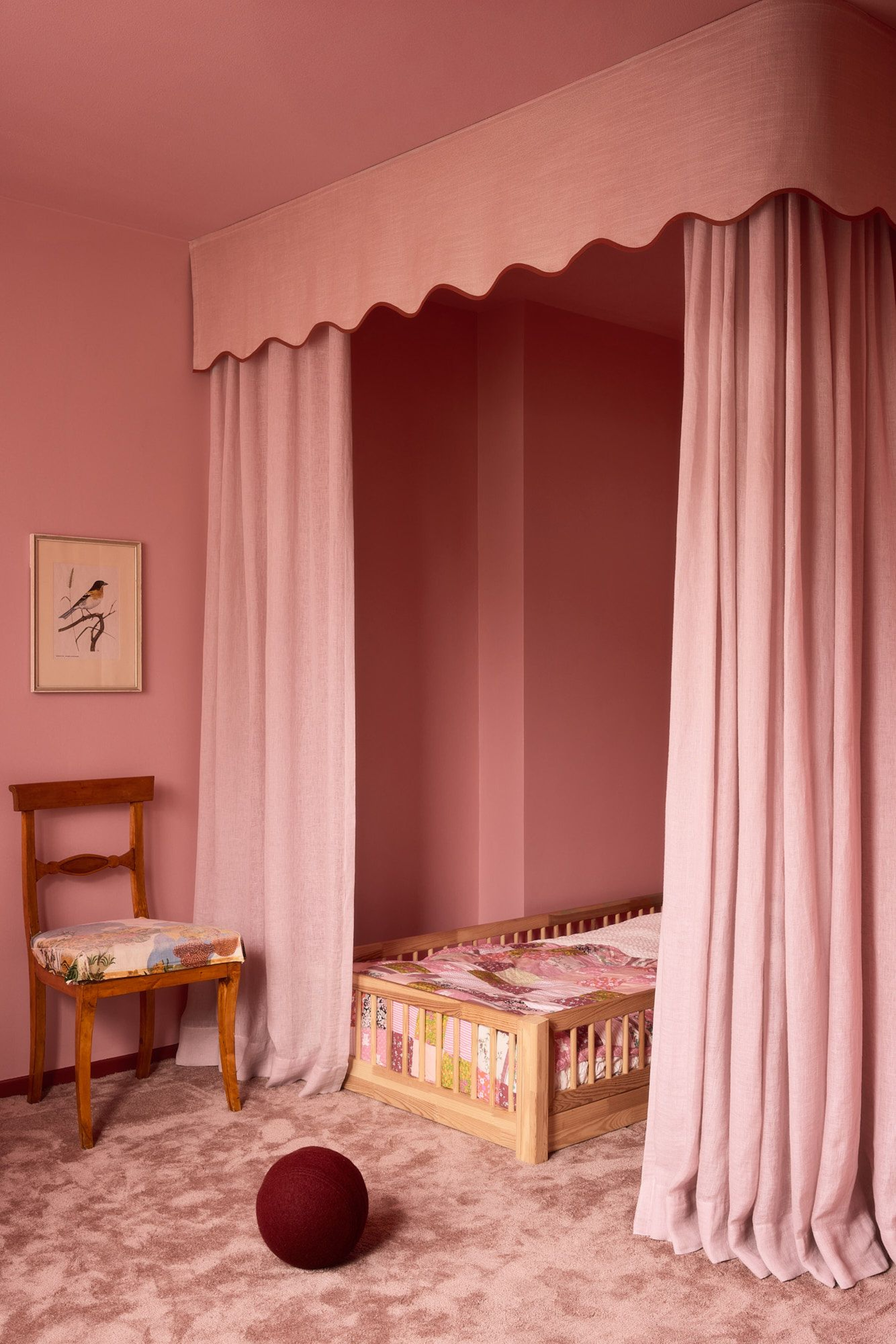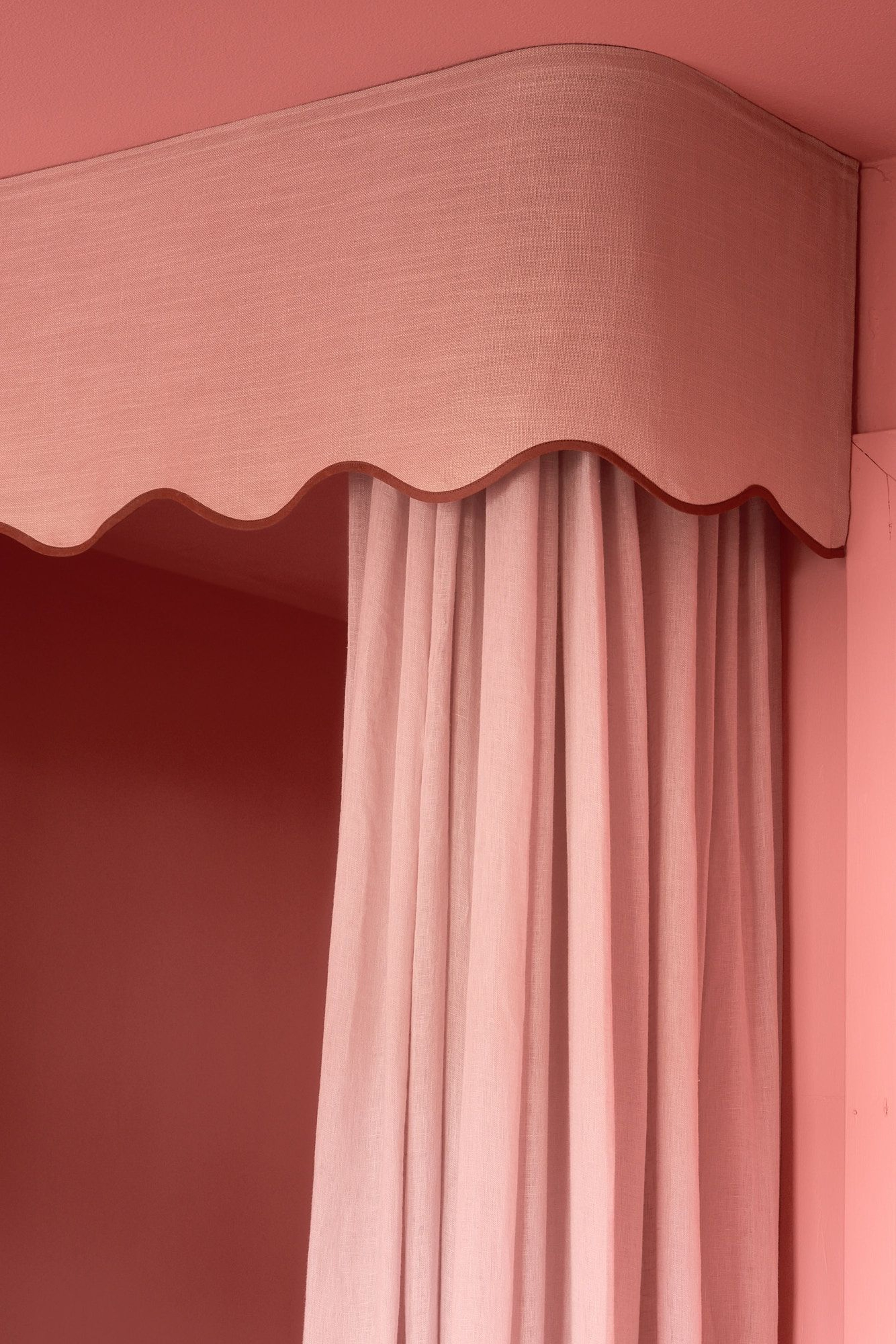 The pink walls are paired with a Scallop Valance in Woven Linen in pink, finished with a terracotta edge trim that adds a subtle contrast. Behind it fall sheer linen curtains in the same shade of pink, softly filtering the light and creating an airy, muted yet playful atmosphere. A room that balances imagination and calm, designed for both play and rest.