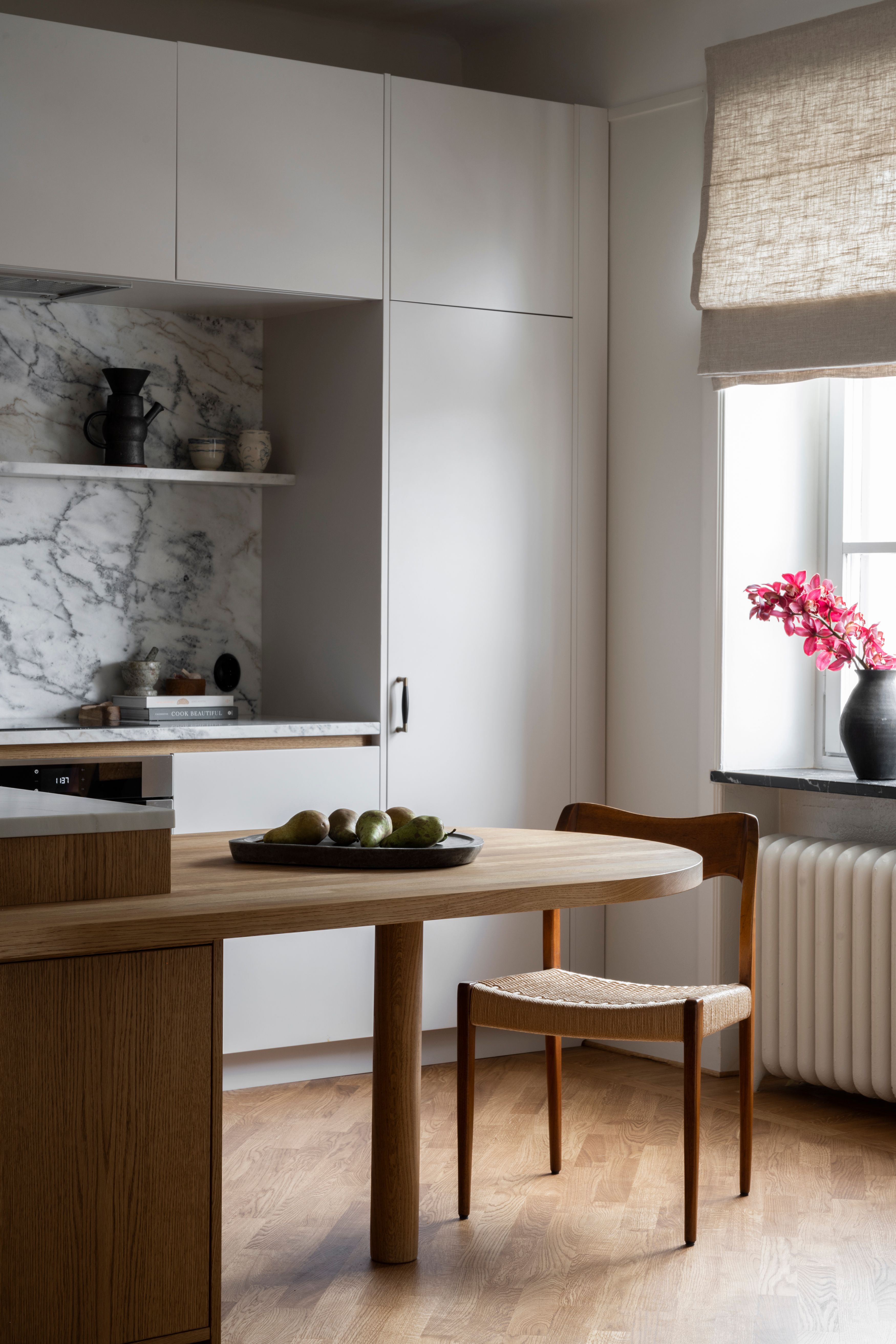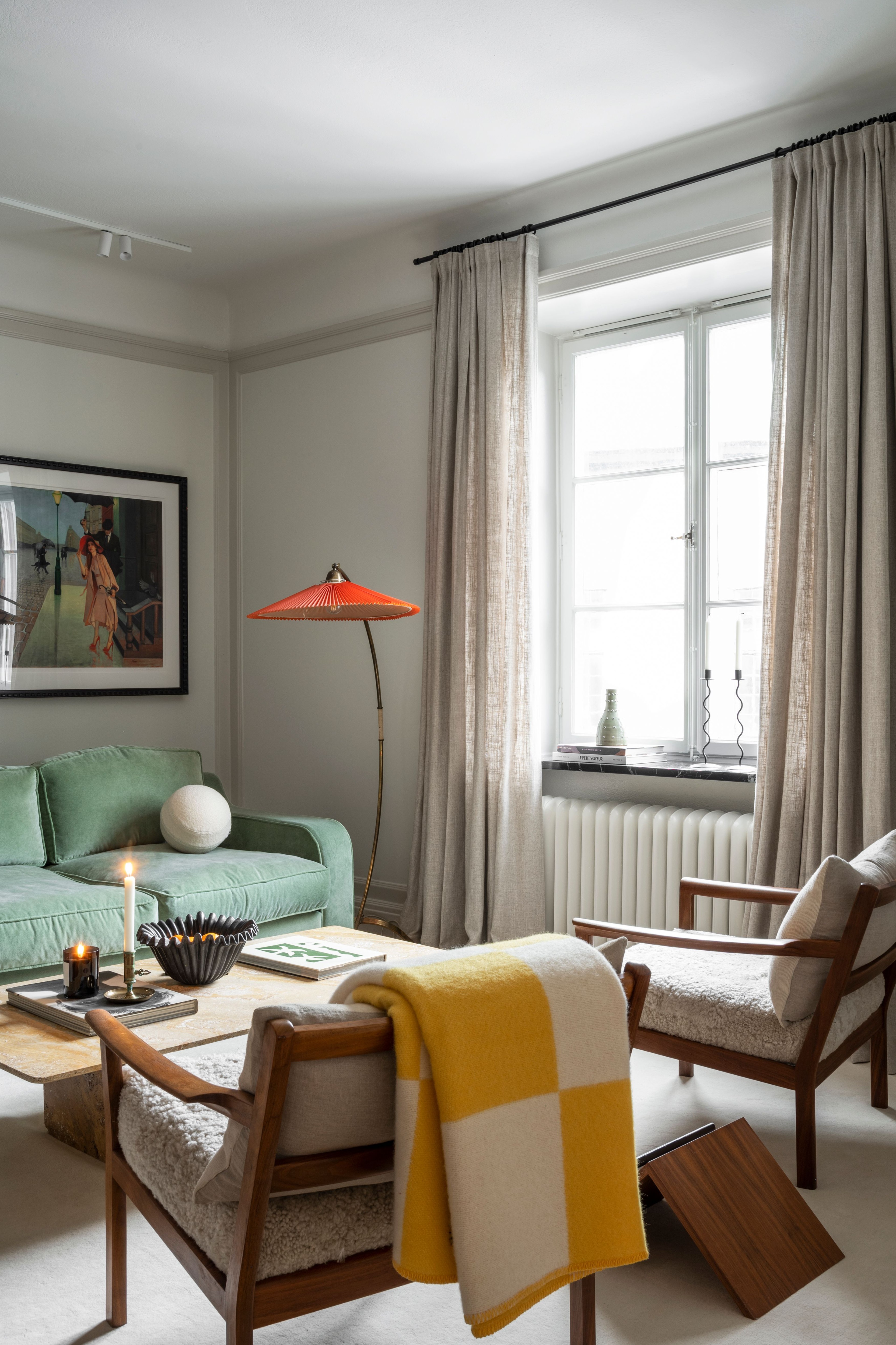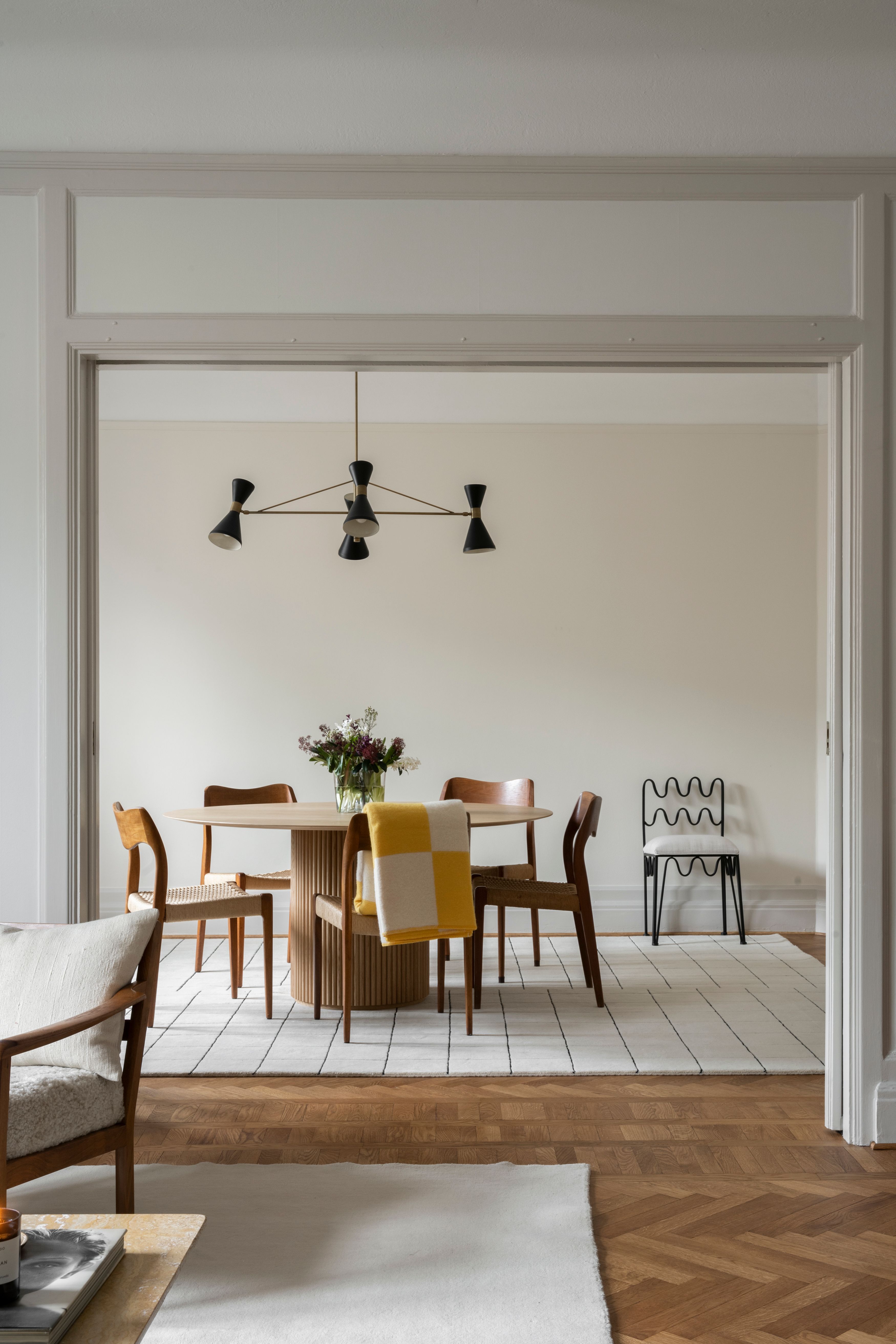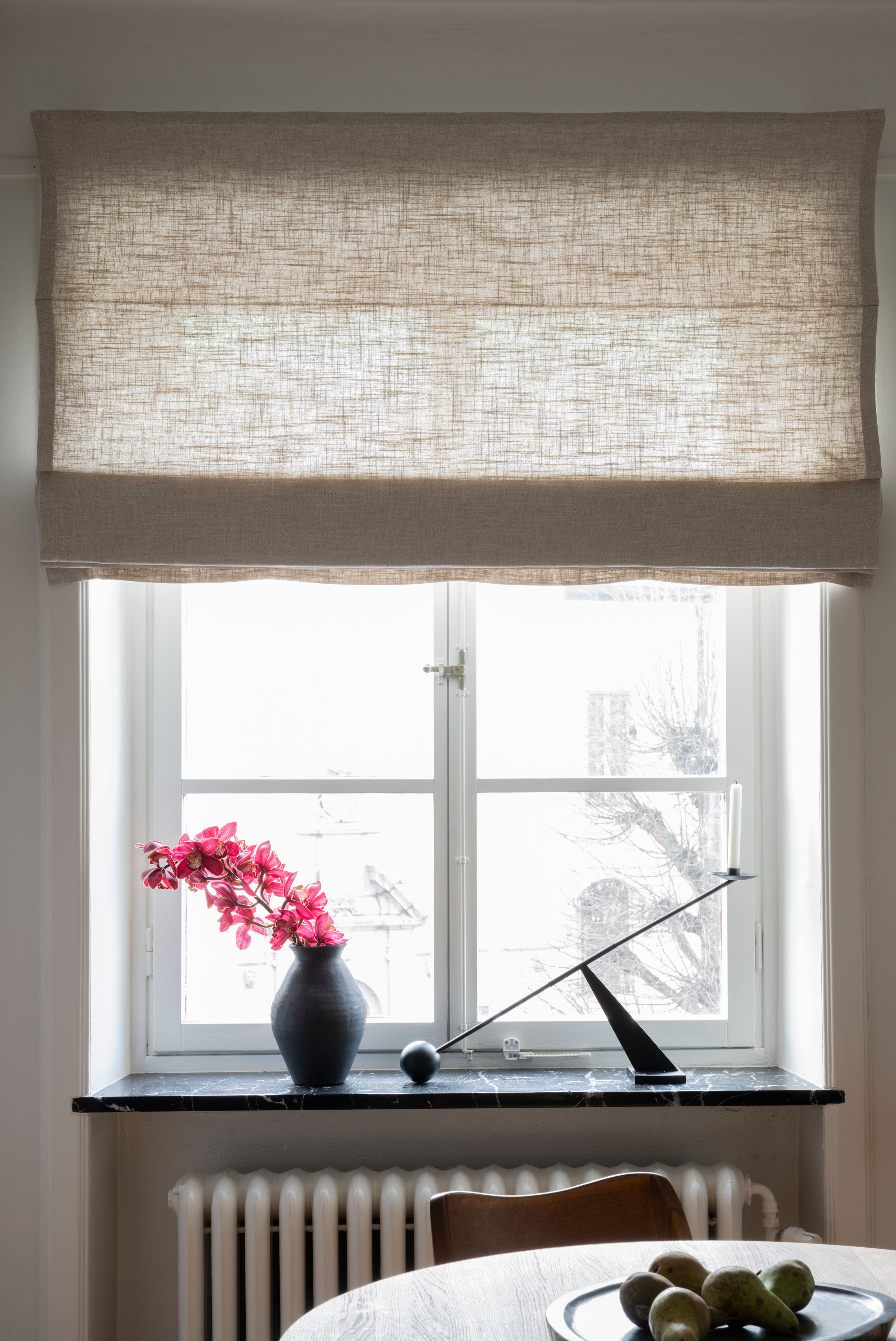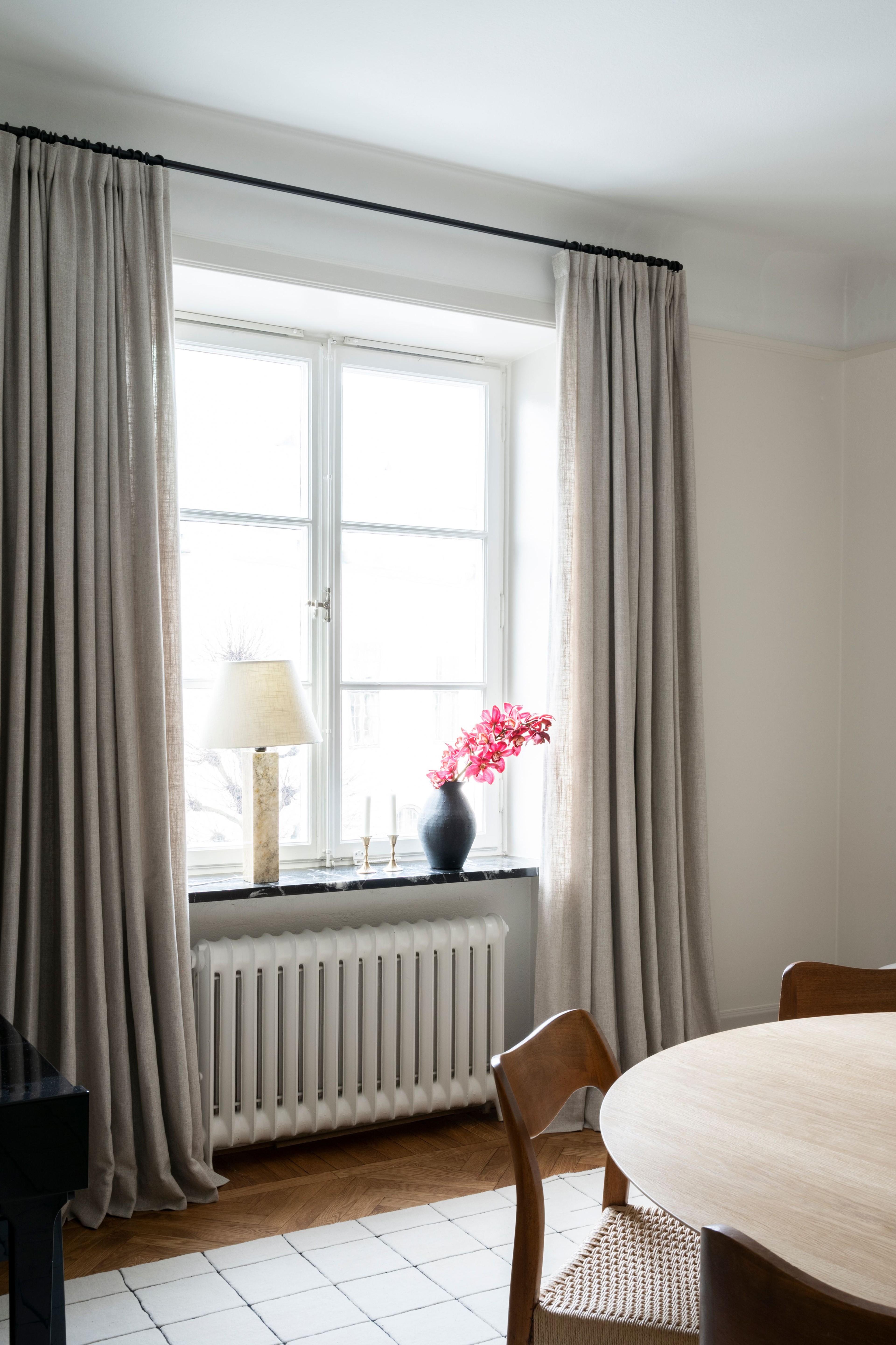 One side of the apartment made out of three adjoining rooms, kitchen, living room och dining area, where the classic turn of the century windows let in generous amounts of light. To tie the rooms together they are all painted in a warm white tone, and have been dressed in the same textile, woven linen curtains in the color Sand. Both the dining area and living room are draped with curtain lengths mounted on black curtain rods, a classic and elegant look, whereas the kitchen got a roman blind in the same fabric. Together with the light walls they create a harmonious and perfect canvas for the decor, where a prominent theme of color ties the rooms together.
