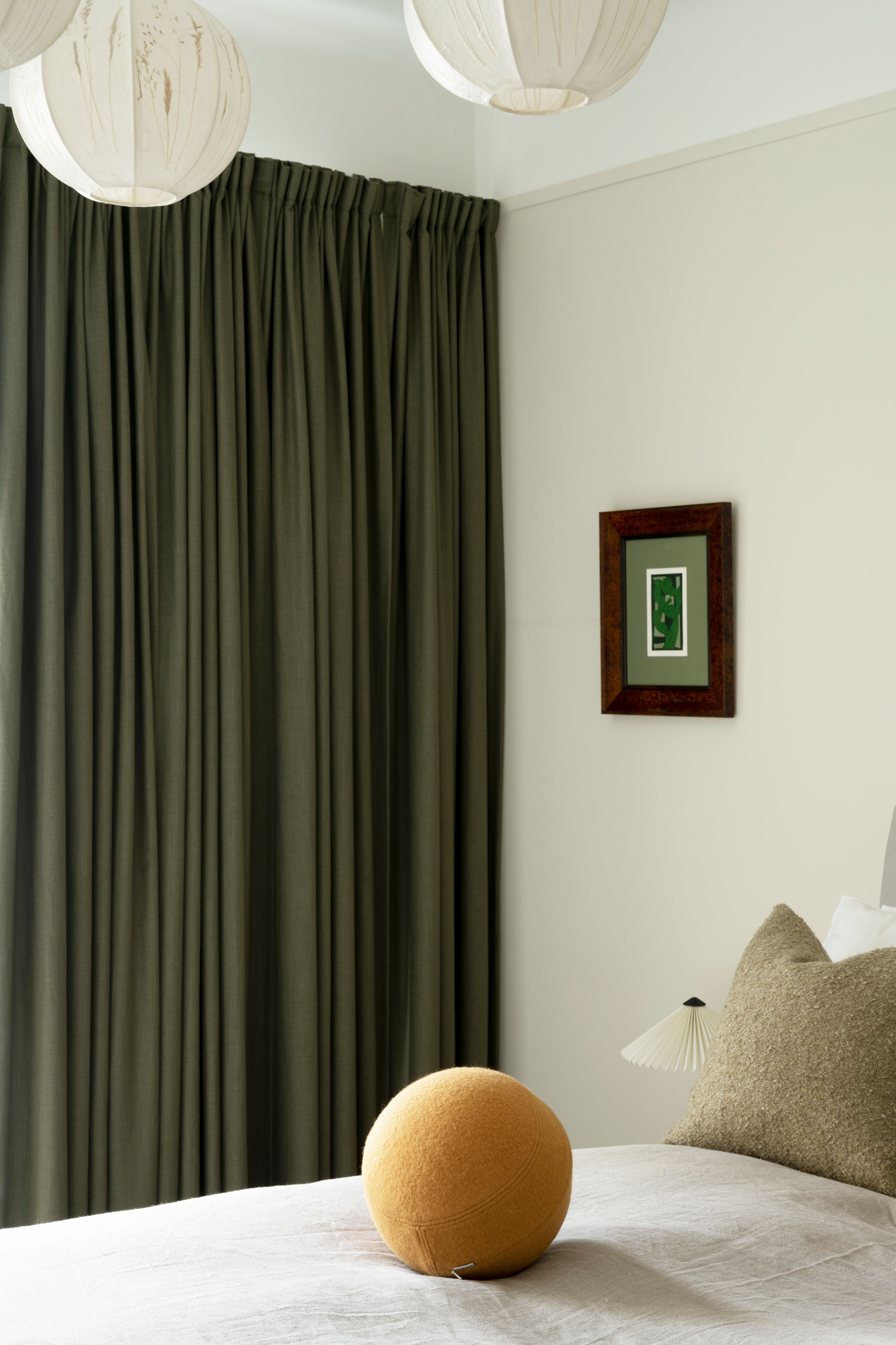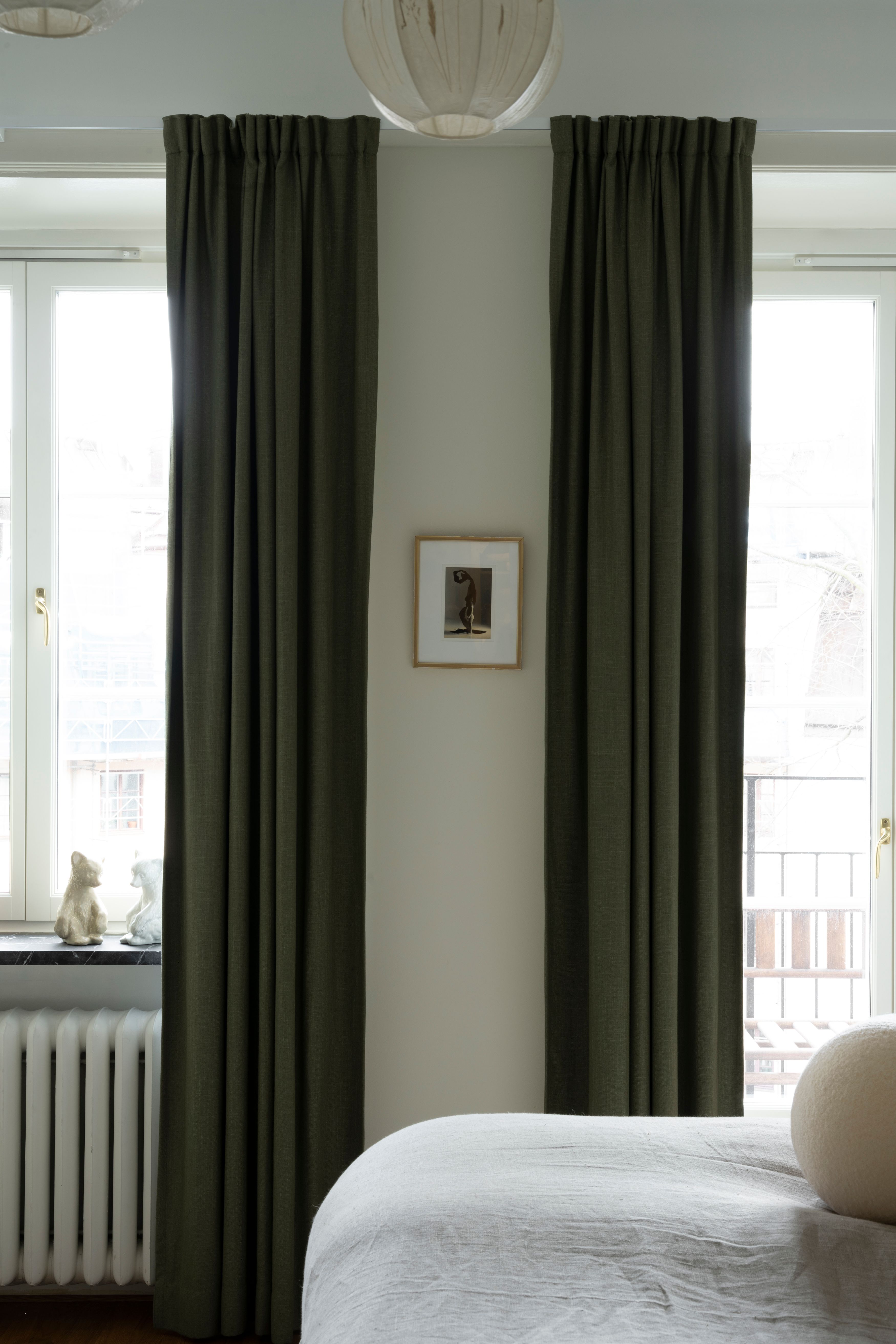 Here the curtains hang from a wall mounted rail, and four curtains in single width together drape all windows along the wall. It’s easy to get scared of a deeper color, but in combination with light walls they rather create a welcome contrast and something compelling in the decor.