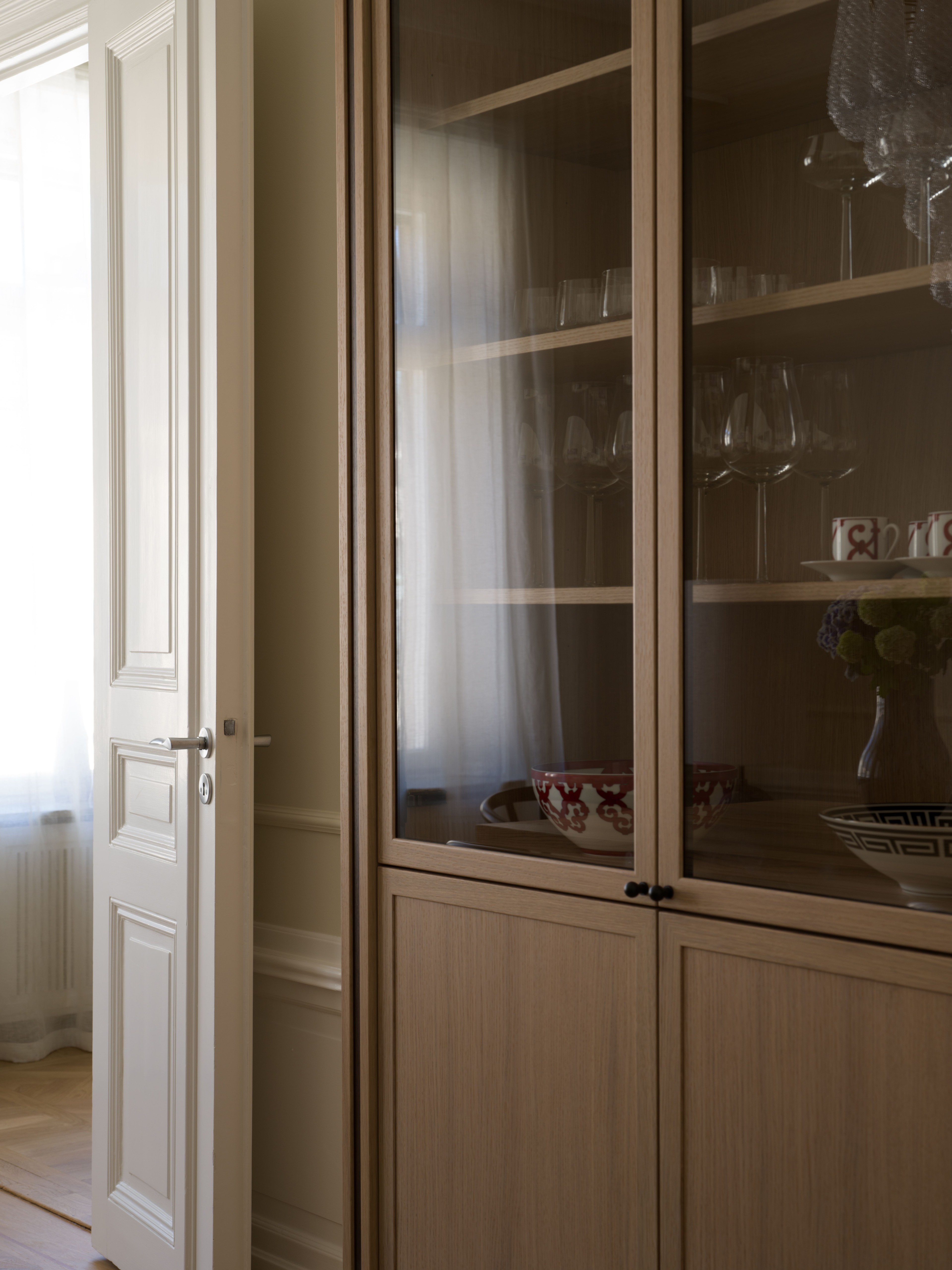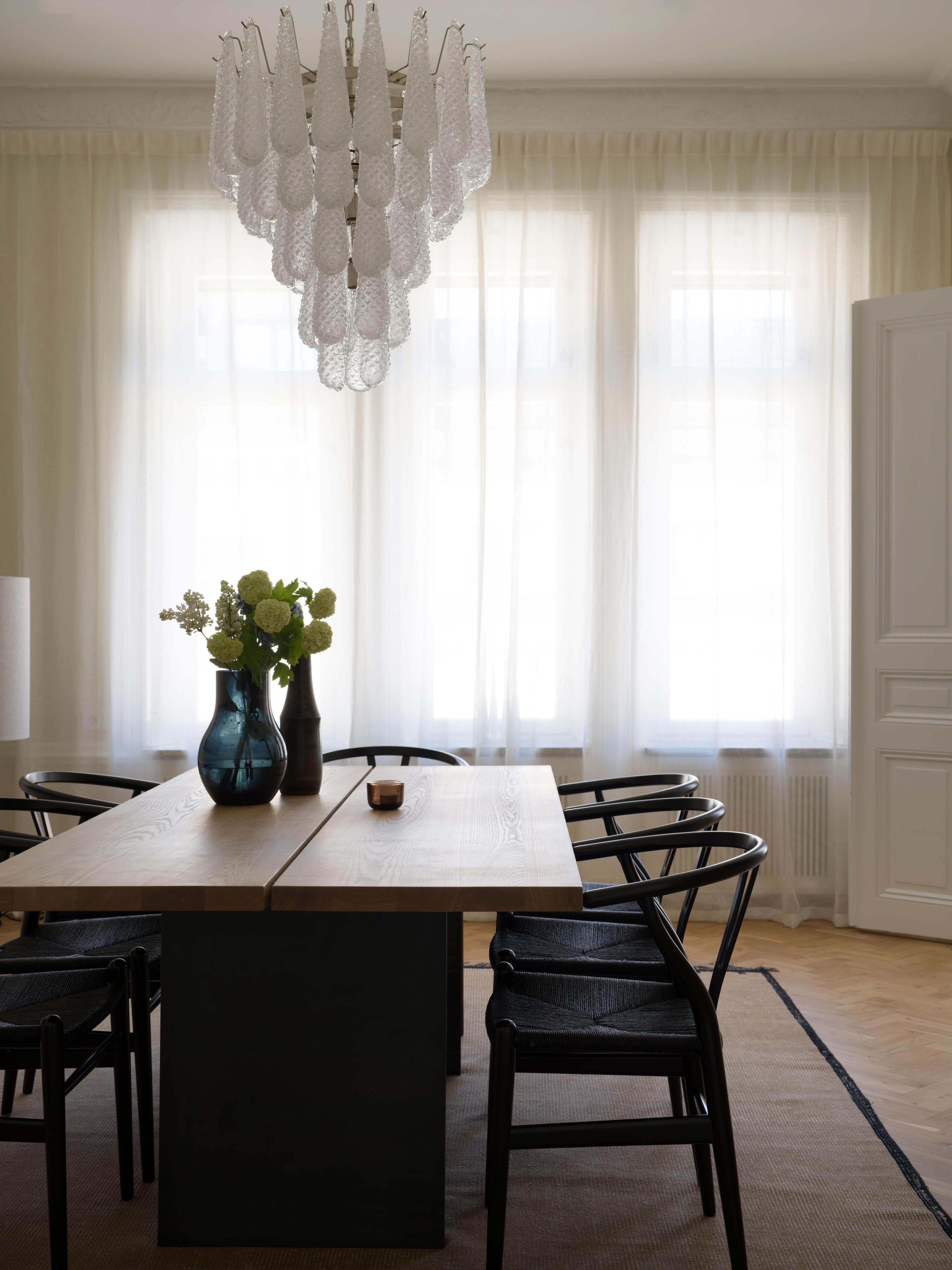 In the dining room, that is connect with the living room by a pair of grand turn of the century doors, thin linen curtains in white drape the windows. The thin linen curtains in particular are a perfect option to get the best of both worlds - both filter the strongest sun rays without compromising on light, and in creating a warm and inviting textile feeling.