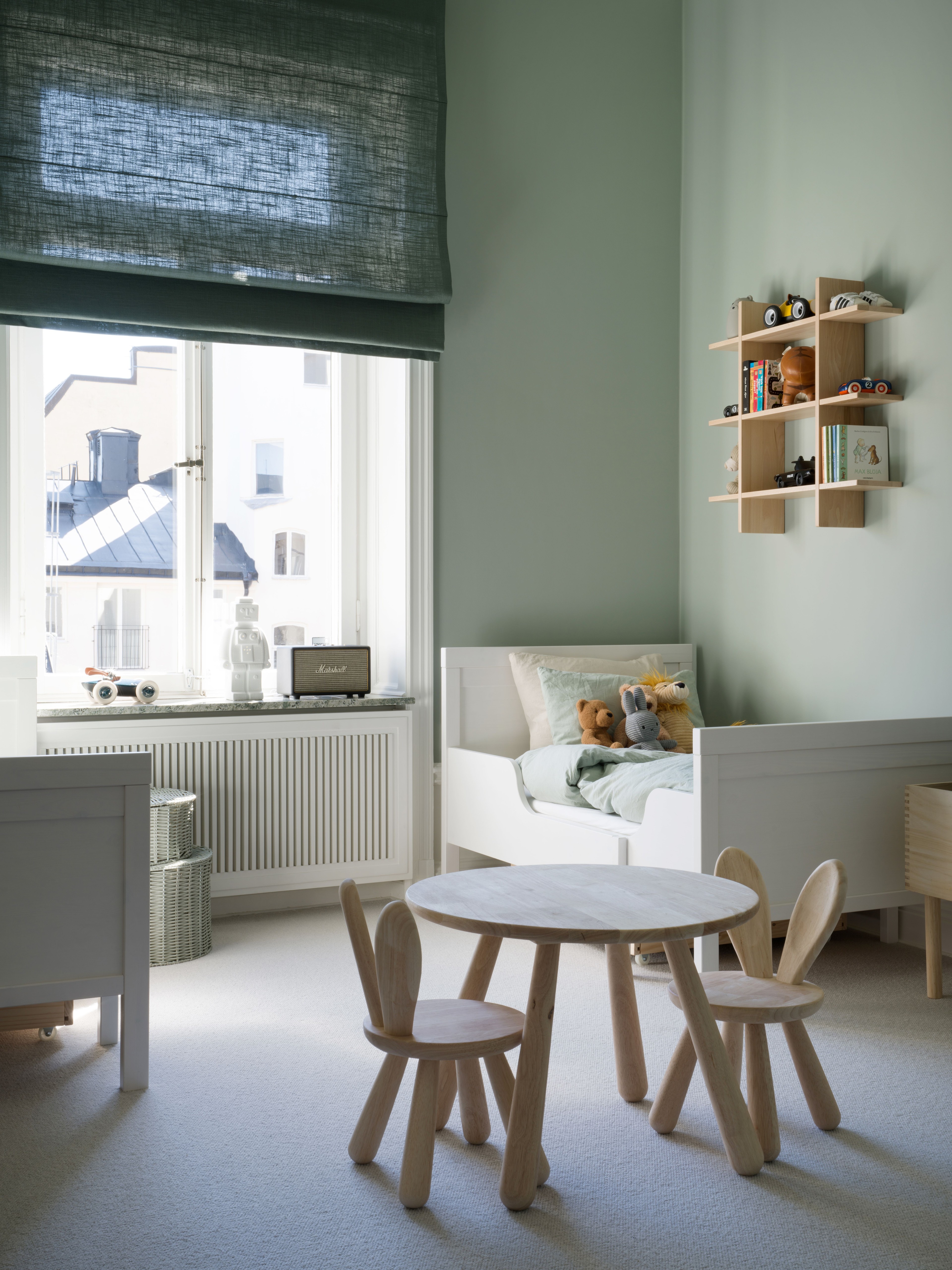 The oldest boys in the family share the blue room, which makes us laugh at the fact that this room could have been entirely designed for Gotains roman blind in Petroleum. The matching with the wall color is simply perfect! The truth is that this match is completely a happy accident, as the initial plan was to choose a curtain in a timeless sand color, but was a last minute change of heart. Behind the roman blind hides the latest addition to our assortment, the black out roller blind, which is a perfect complement in making even the most headstrong children accept night time!