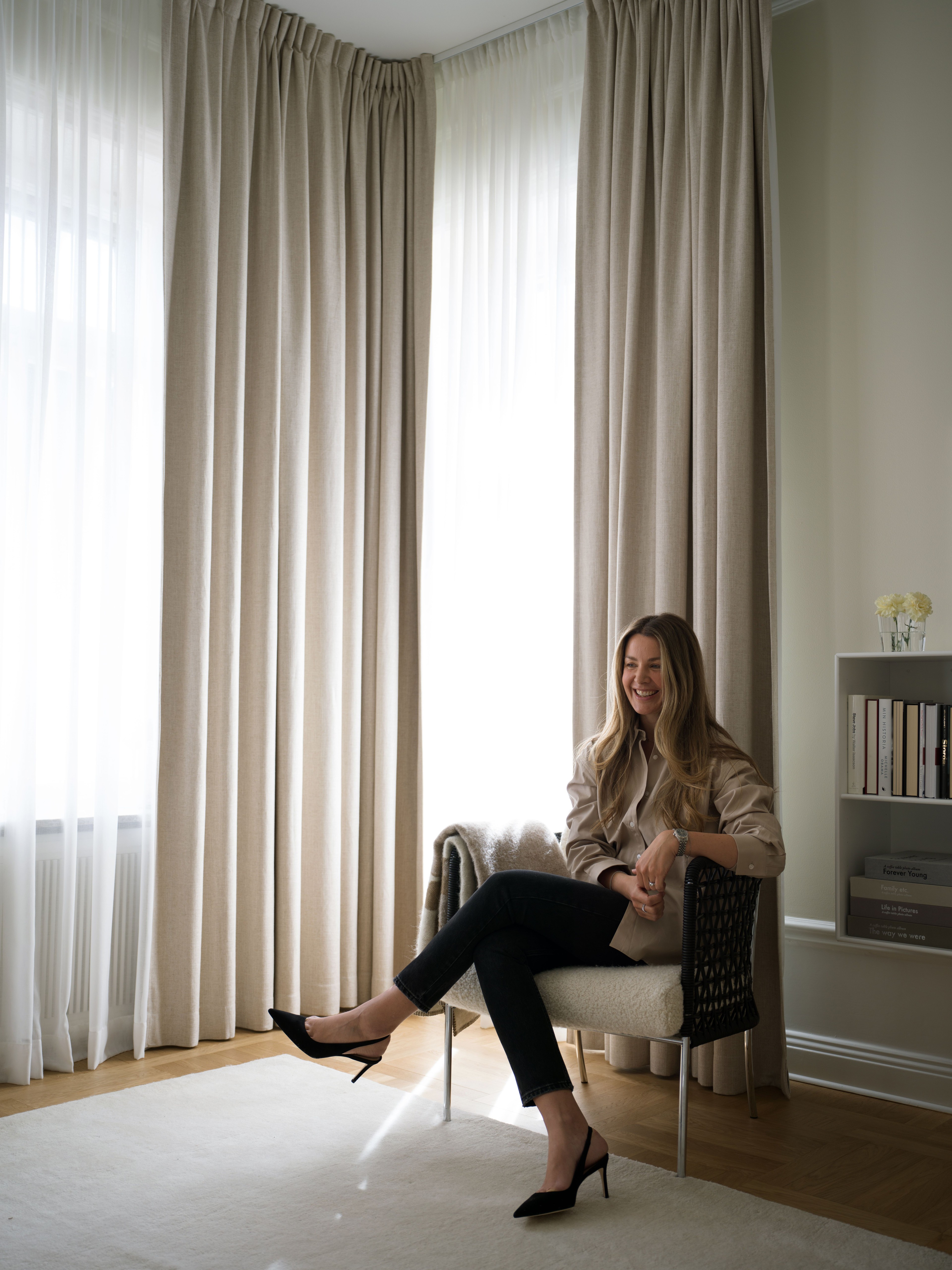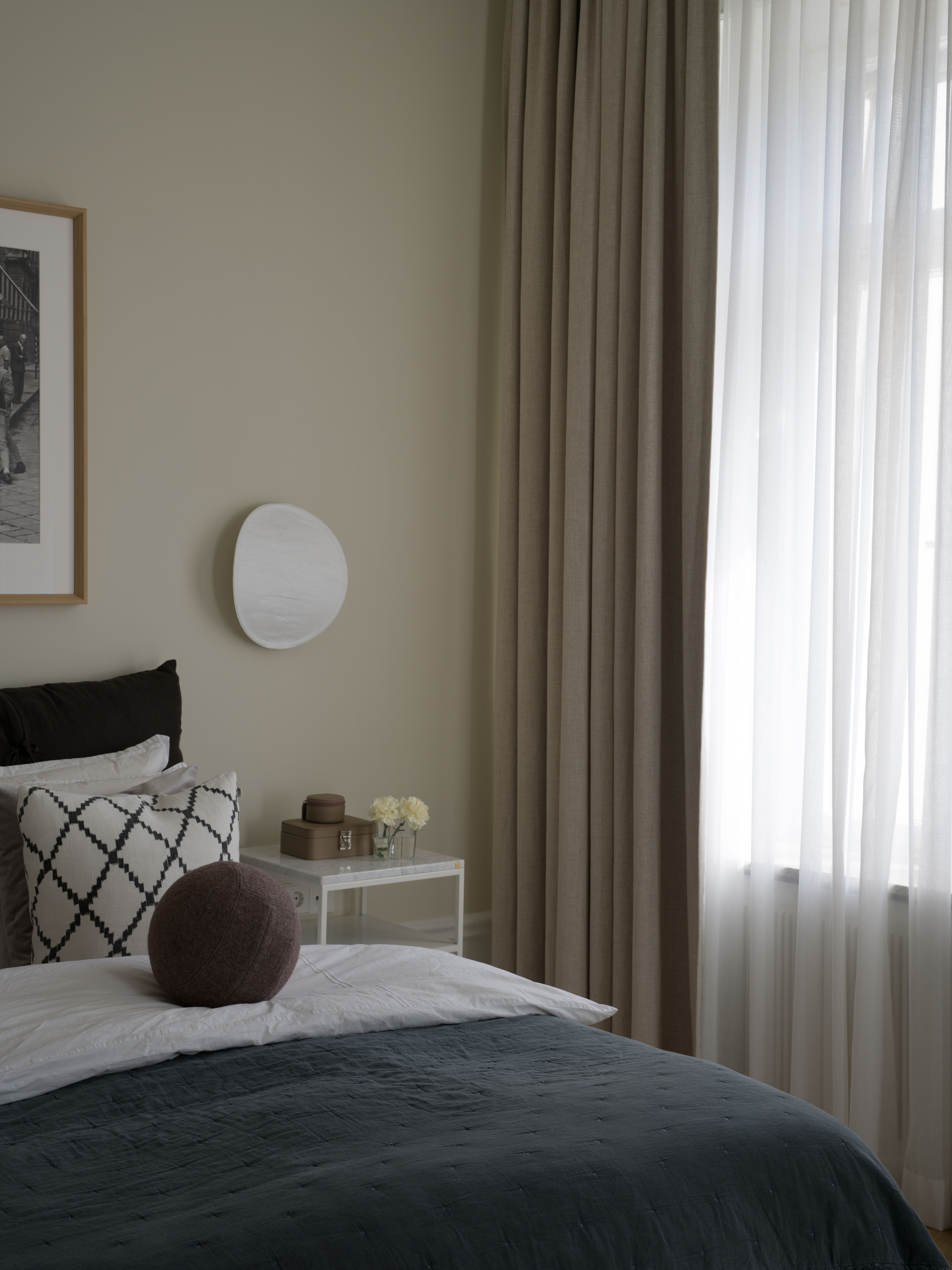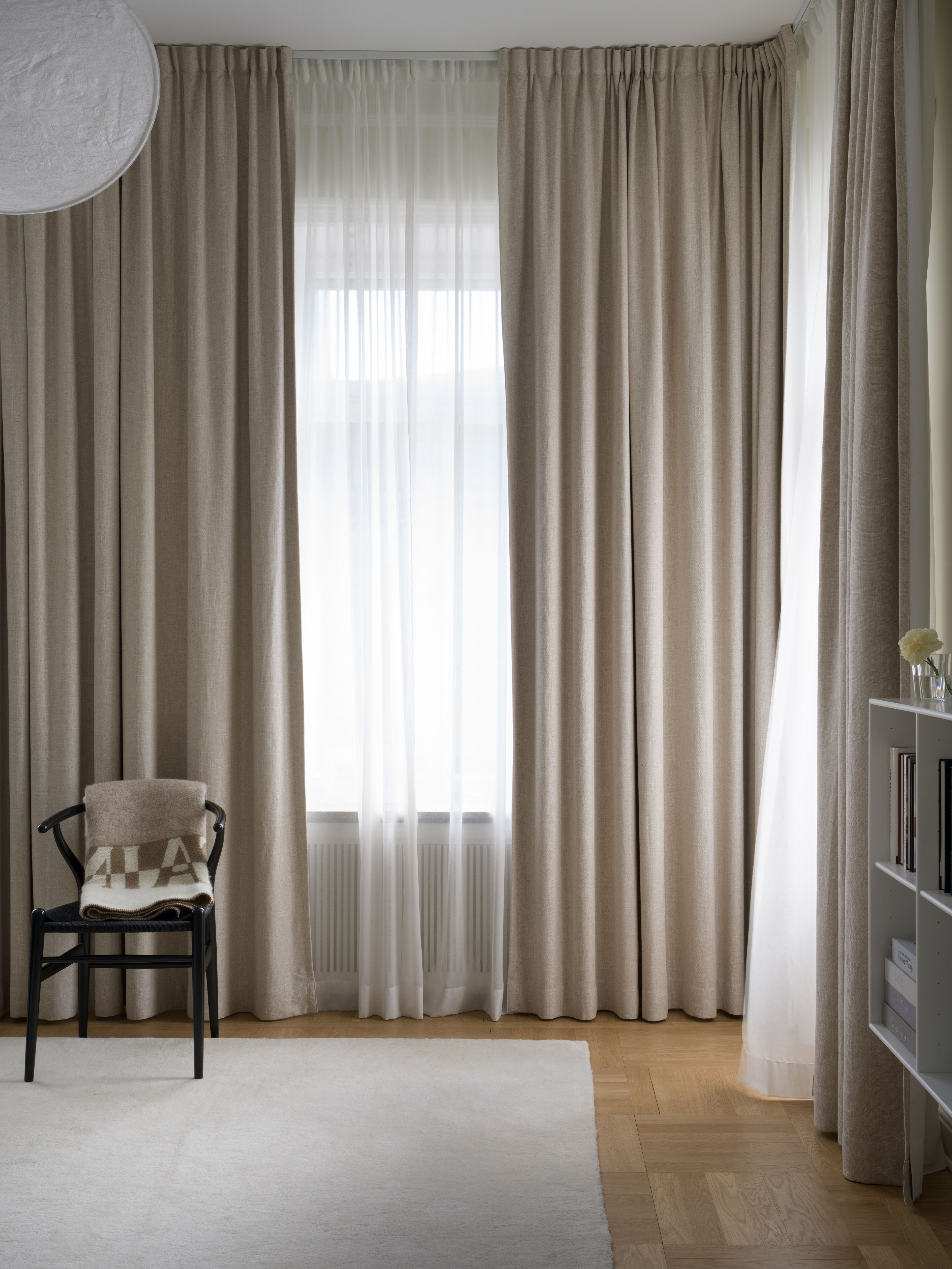 At Michelle and Davids we find windows facing multiple directions, and a ceiling mounted track is bent and fitted in order for the curtains to be moved seamlessly between windows. The sand colored curtains go hand in hand with the sober tone of the walls, and create harmony throughout the room.