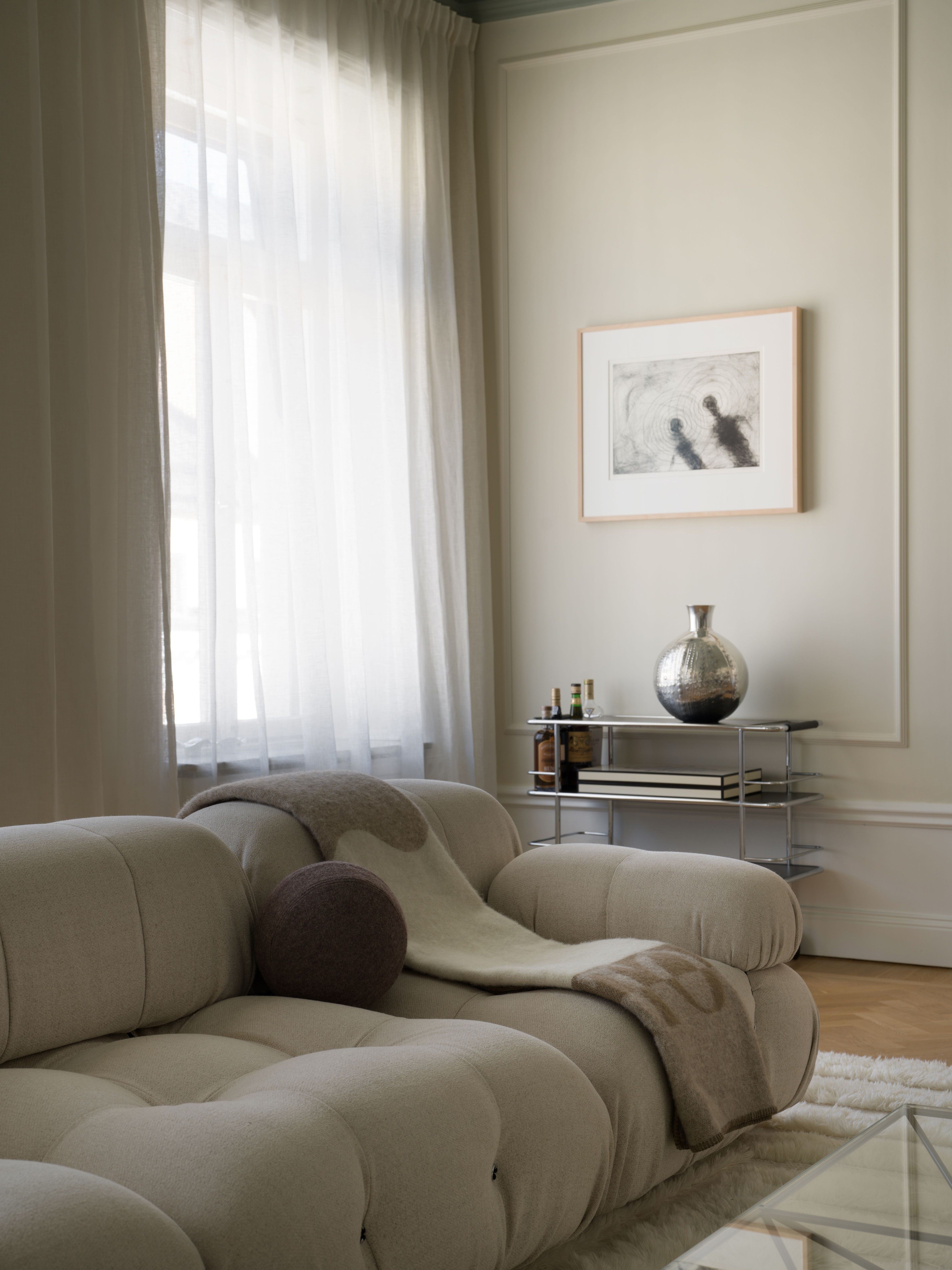 The family has only lived in the newly renovated apartment for a few months - but the work that goes into creating a seamless, modern and unique home has been going on for a long time. Both David and Michelle have a clear sense of shape and color, and their interest in art is reflected throughout the apartment. We all fall in love with a piece that decorates the wall over the bar cart, and Michelle tells us that this is one she holds very dear, as she gave it to David as a morning gift on their wedding day.
