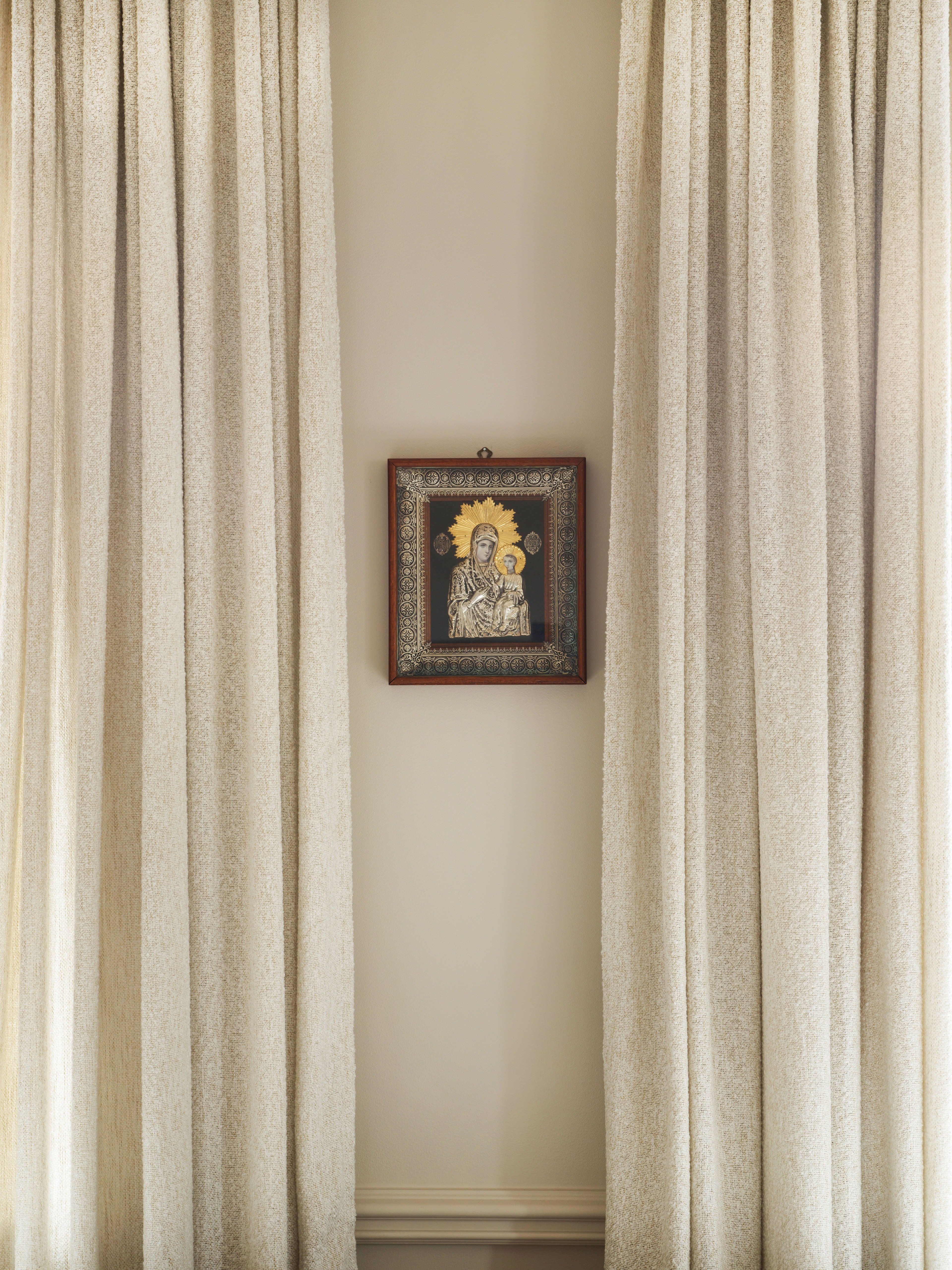 The living room is draped with new ivory bouclé curtains, whose texture adds both a layer of warmth and softness, but also that final piece that ties together the decor of the room. The furniture pieces are few, but carefully curated. Every chair, every table, has a story to tell, either through its design, its origin, or the artistic process through which is was created.