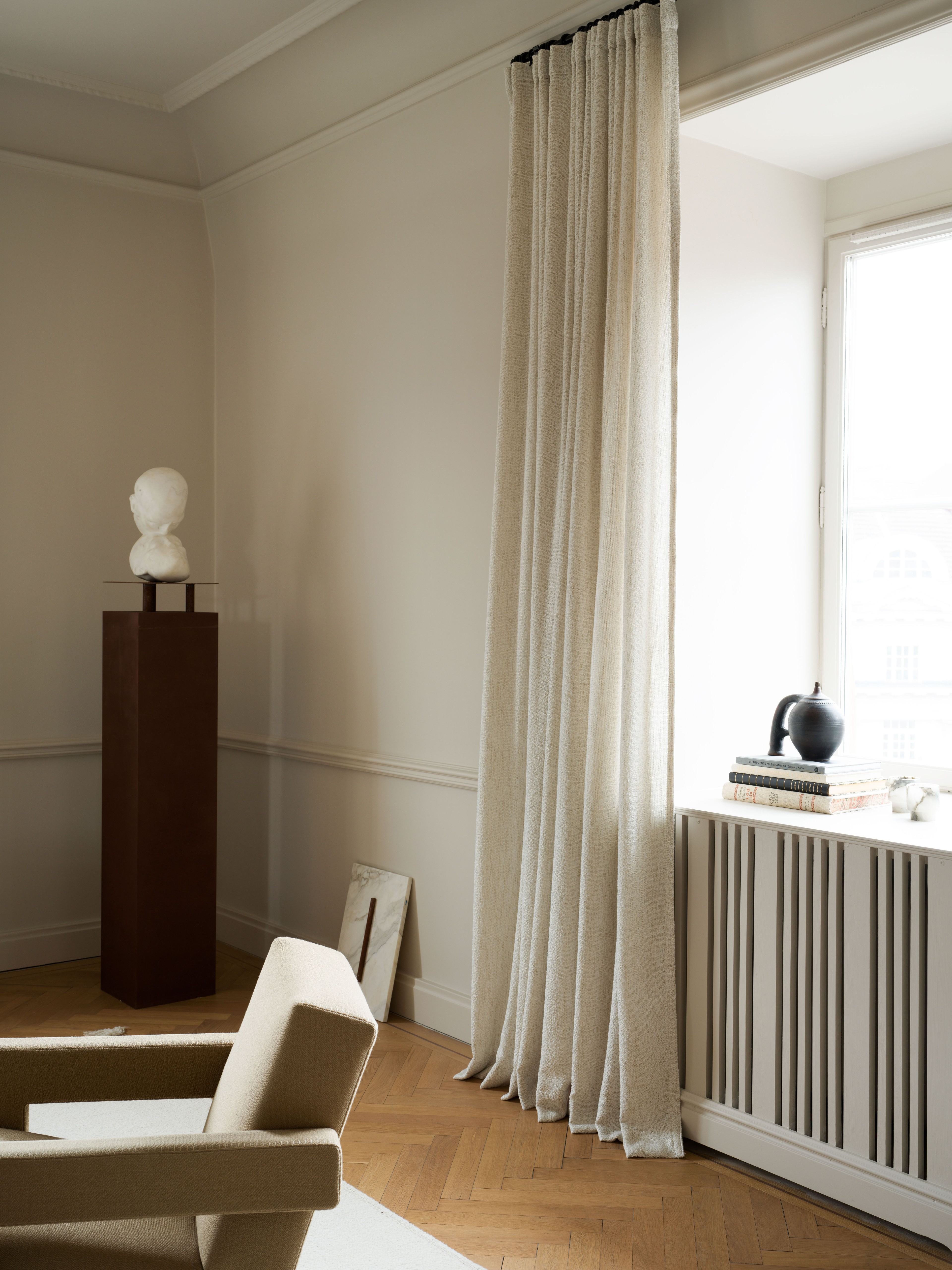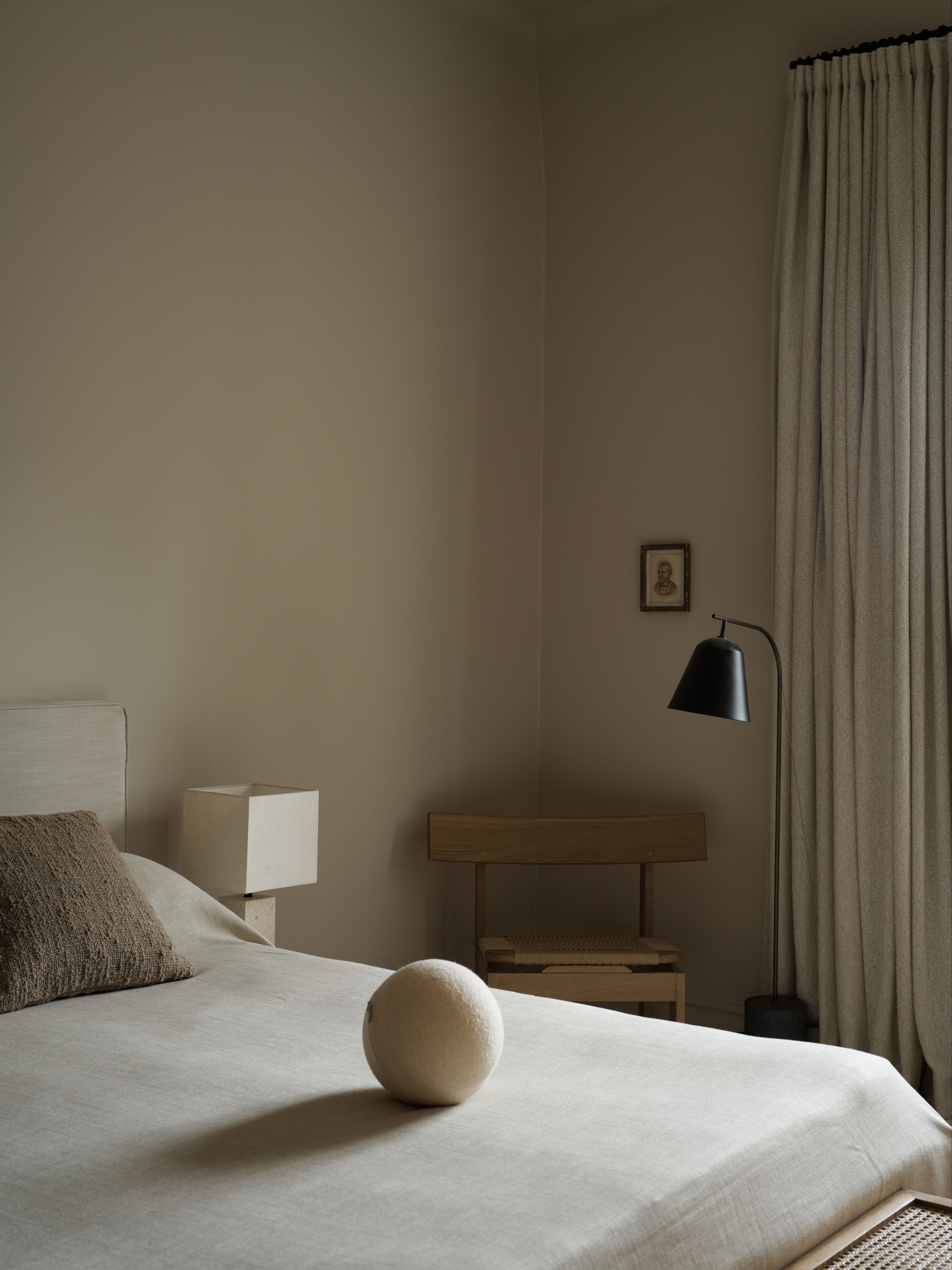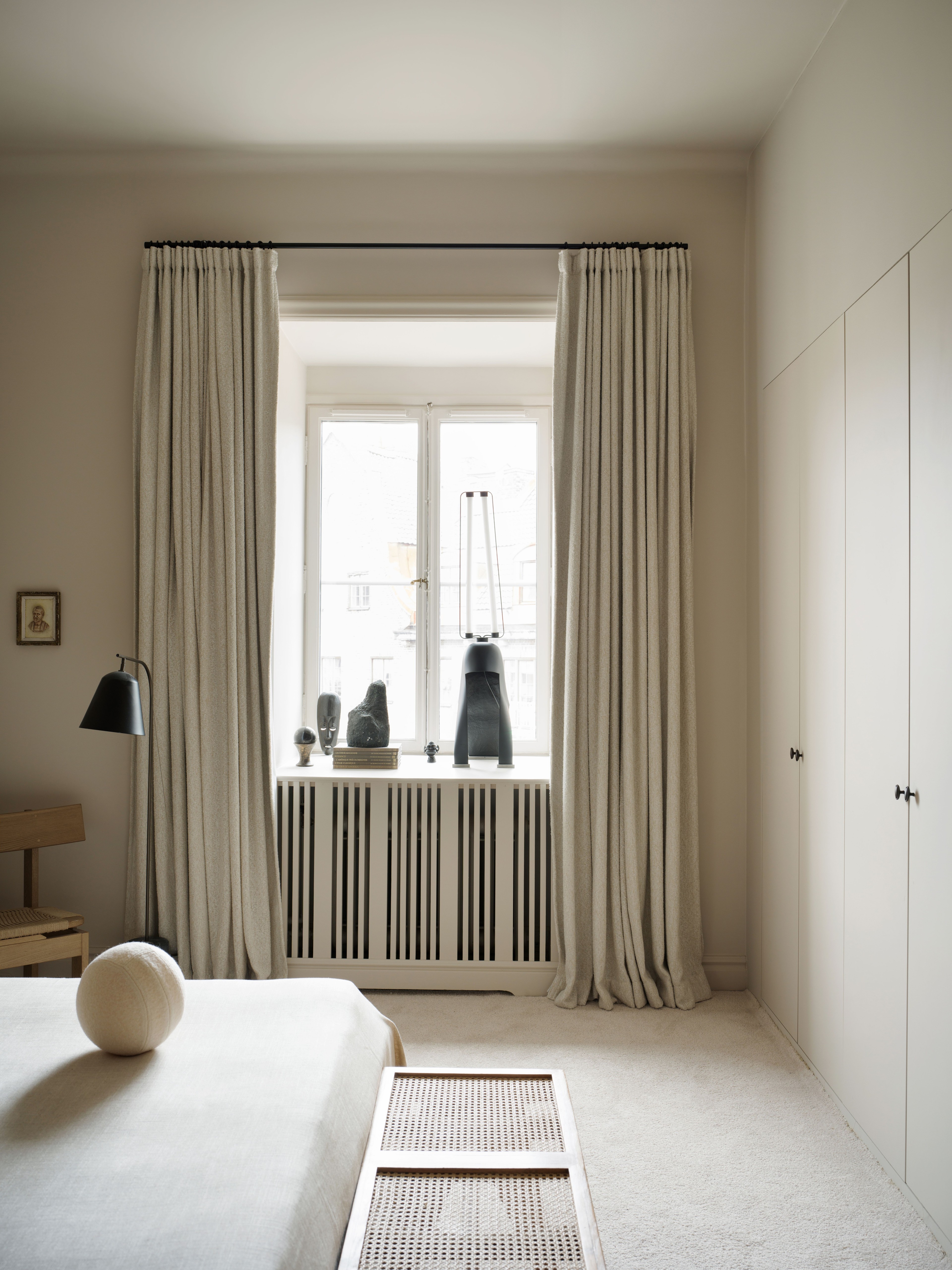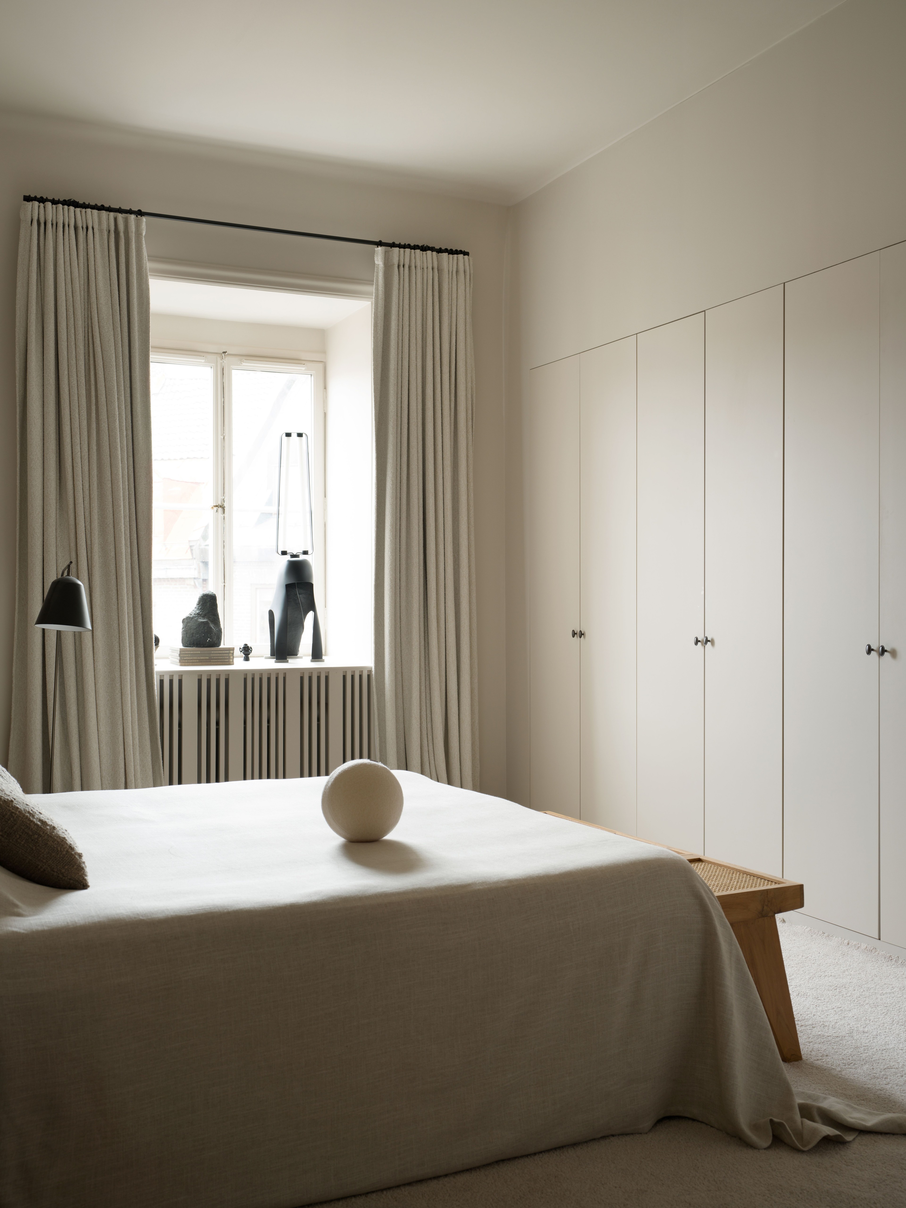 In the bedroom aestetic and function meet in harmonious symbiosis. The room is a sanctuary where the city's noise softly fades away behind blackout bouclé drapes. Aside from being a practical detail, the curtains add texture and weight to the room for a sense of calm and privacy.