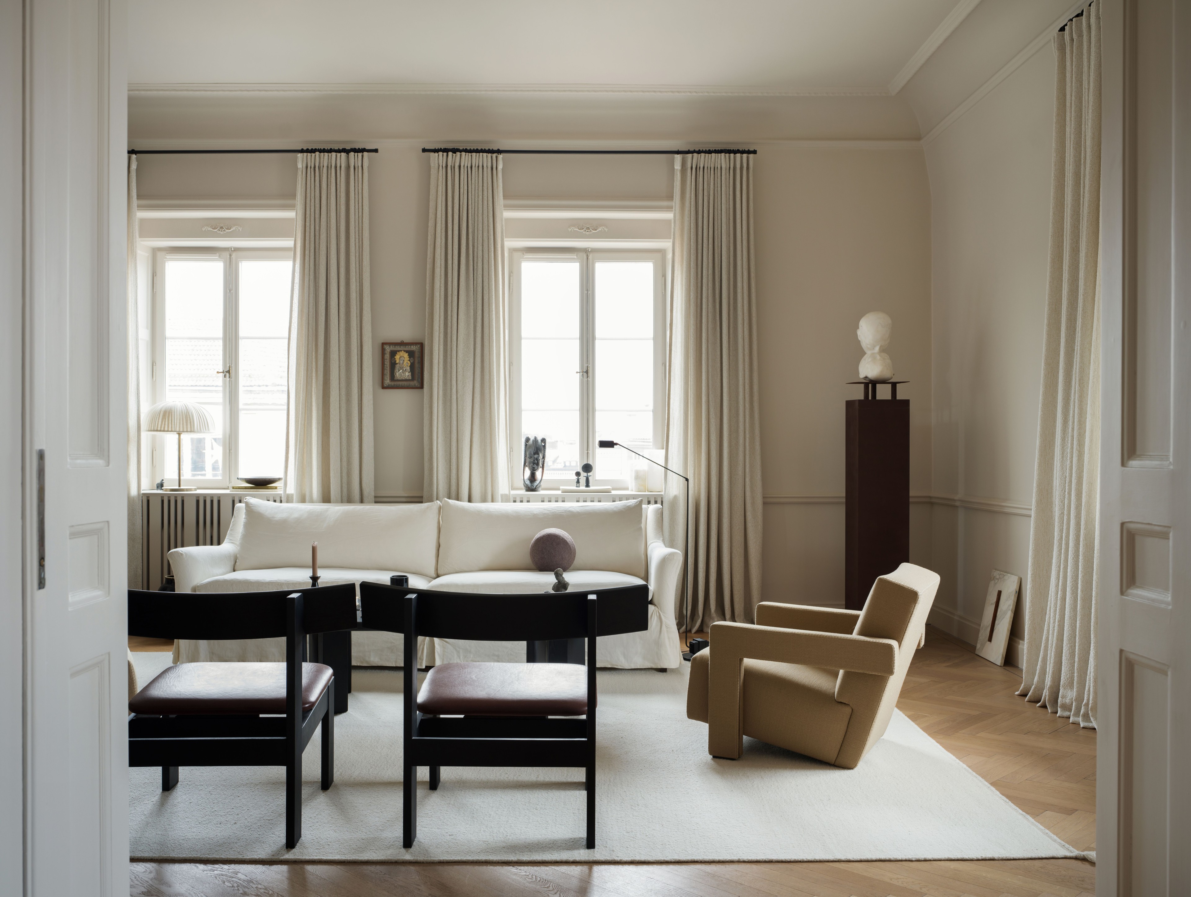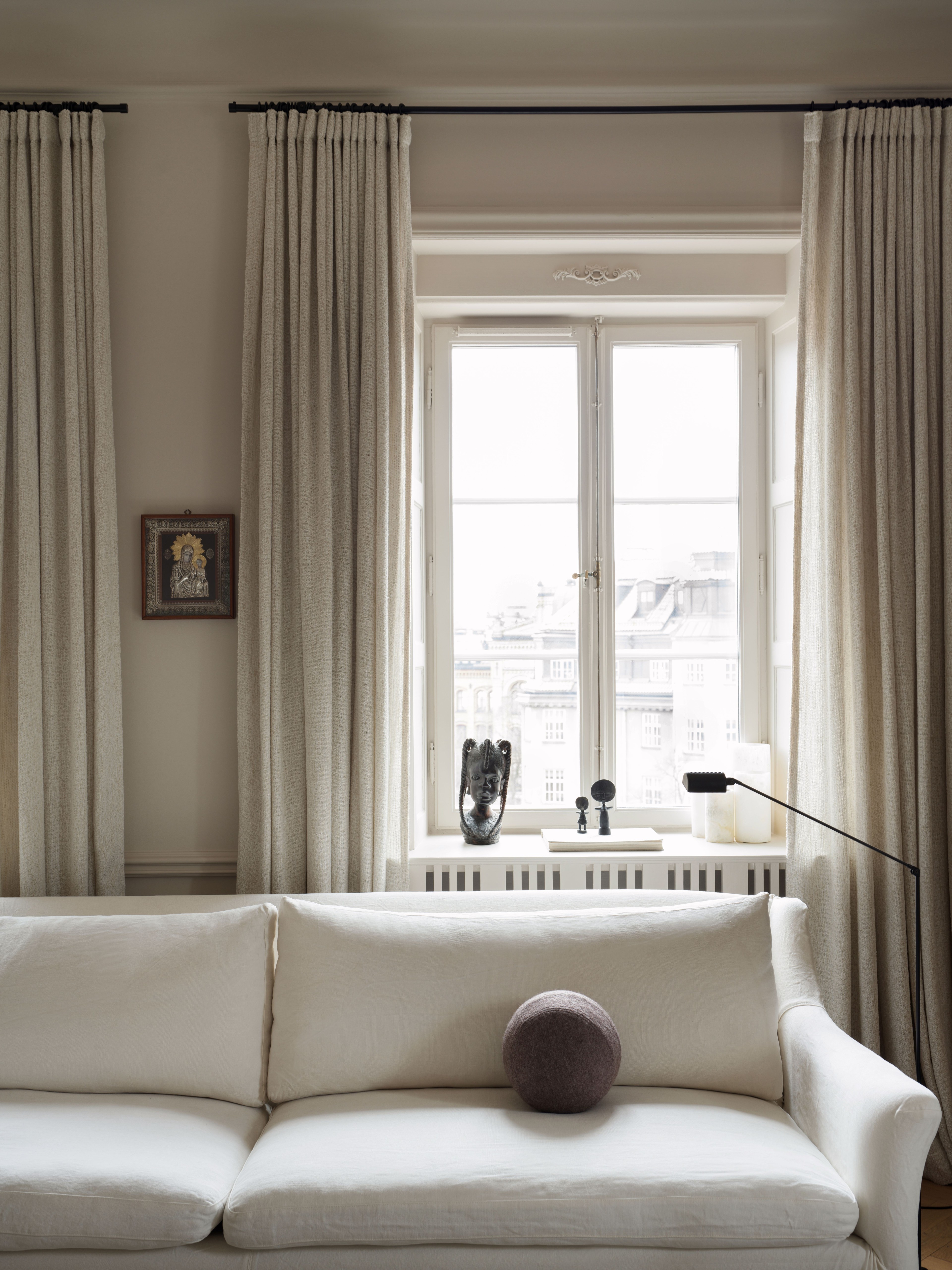 The room is decorated with an eye for details where every object not only is chosen for its design, but also for its story. One of those details is the lamp that stately decorates the window sill, a unique creation from a Rick Owens fashion show. The lamp is as much a sculpture as it is a source of light, and a perfect conversation starter that carries memories from the dynamic atmosphere of the world of fashion.
