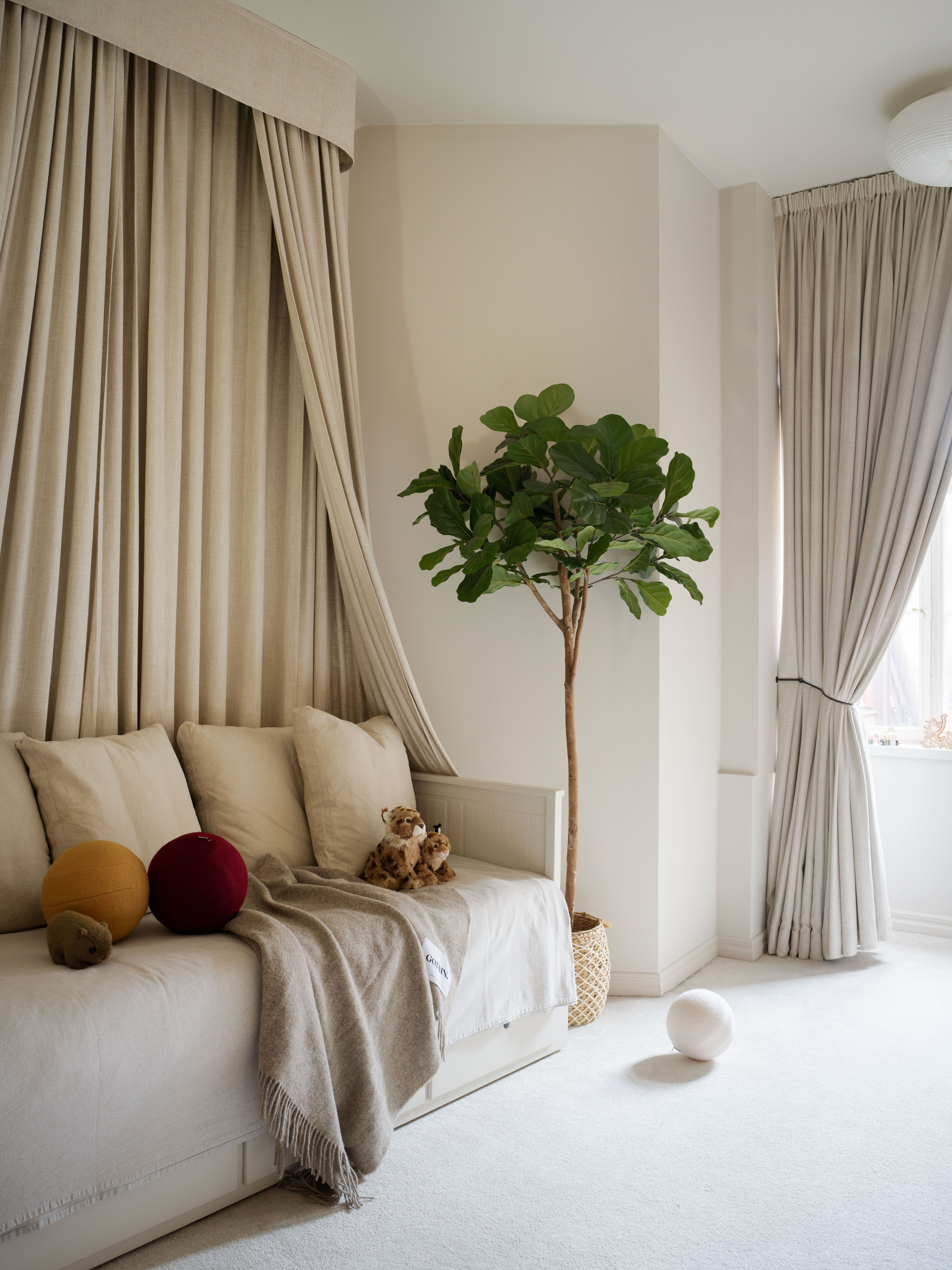 In the childrens room dreams have taken shape in a world where fantasy and elegance meet. Here an extravagant bed canopy has been created, a centerpiece that embraces their daughter Mini's bed and transforms it into a place for tales and sleep. The bed canopy is made out of curtains in woven linen and drapes down from an elegant curtain pelmet in the ceiling.