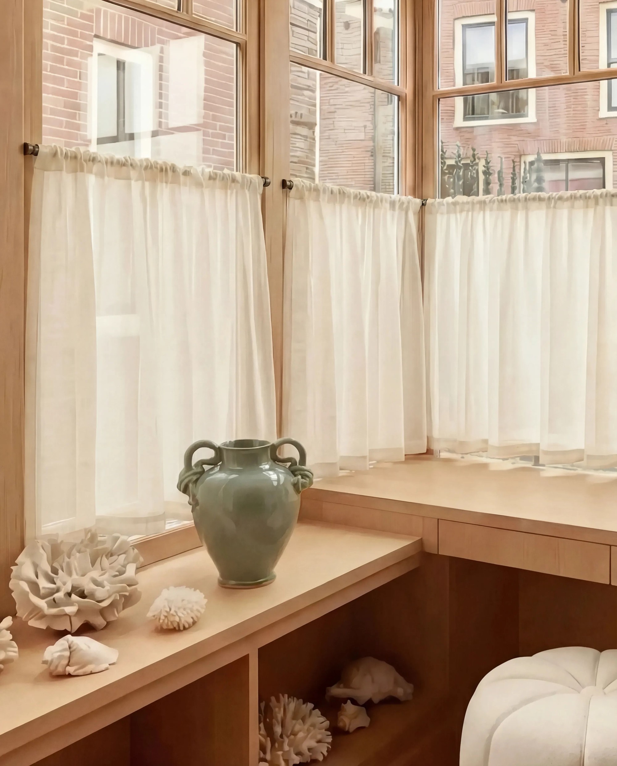 'Classic' is a café curtain in a rustic style, drawing inspiration from the French countryside and its nature-inspired interiors. The soft pleats of the curtain create an elegant and timeless look that complements all types of interior styles, from rustic to modern, depending on how it is paired.