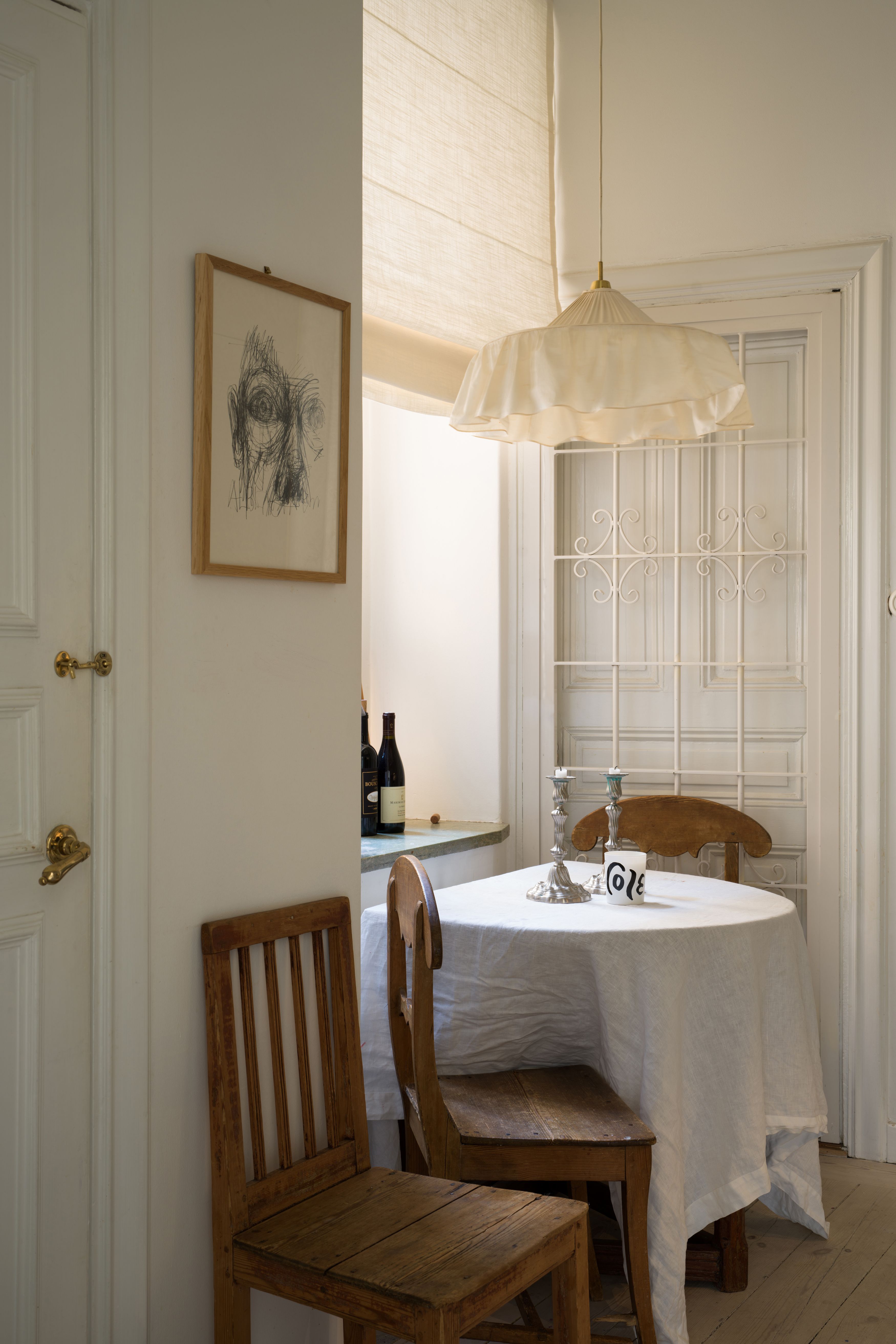 Did we just step in to an Italian tavern or Filippas kitchen? No, we are still at Östermalm, but the old wooden chairs, collection of wines and textiles can truly make you wonder. Here a roman blind drapes the window with the same material as the curtains in the living room, perfect for a kitchen window where space is limited. In the kitchen you can also find an old entrance with a decorative interior door in steel, and Filippa tells us she has considered hiding it behind a curtain. Even if the Gotain-team always are partial to ”more is more” when it comes to textile, we agree that it would be a shame to hide the beautiful door as it only enhances the bistro-feeling of the kitchen.