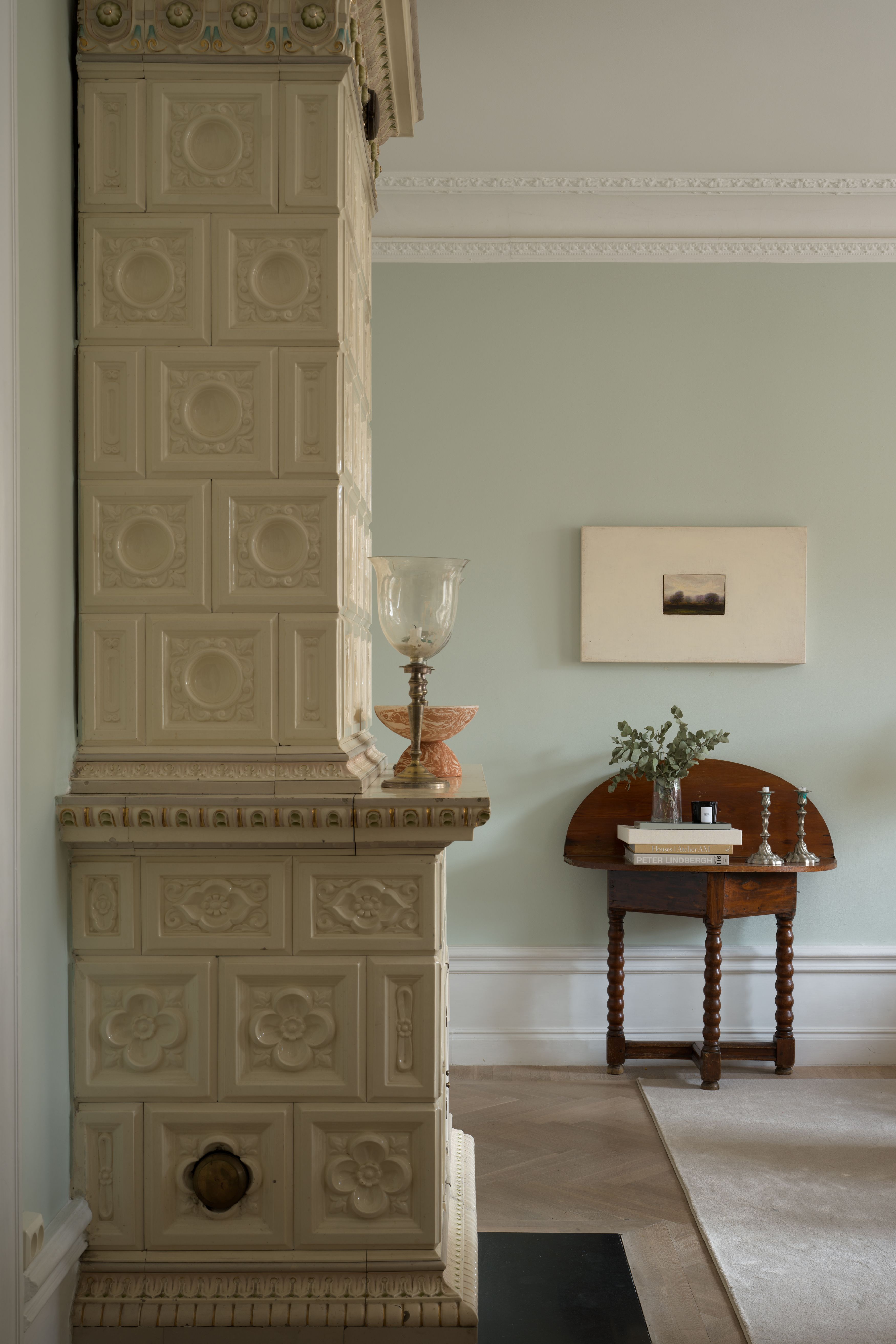 The crown jewel of the living room is a tiled stove in creme white with decorative ornaments, a statement both visually and physically. The colored walls create contrast and give space for the tiled oven, and are beautifully complemented by the carefully chosen art which decorates the walls. In more than one place we find small collections with details from all corners of the world, and we completely fall in love with a pile of coasters on the drink cart signed Filippas childhood friend Beata Heuman. Filippa narrates the scenario of a night with friends where she loves serving a Negroni, and we find common ground in our love for a nice cocktail over a glass of wine.