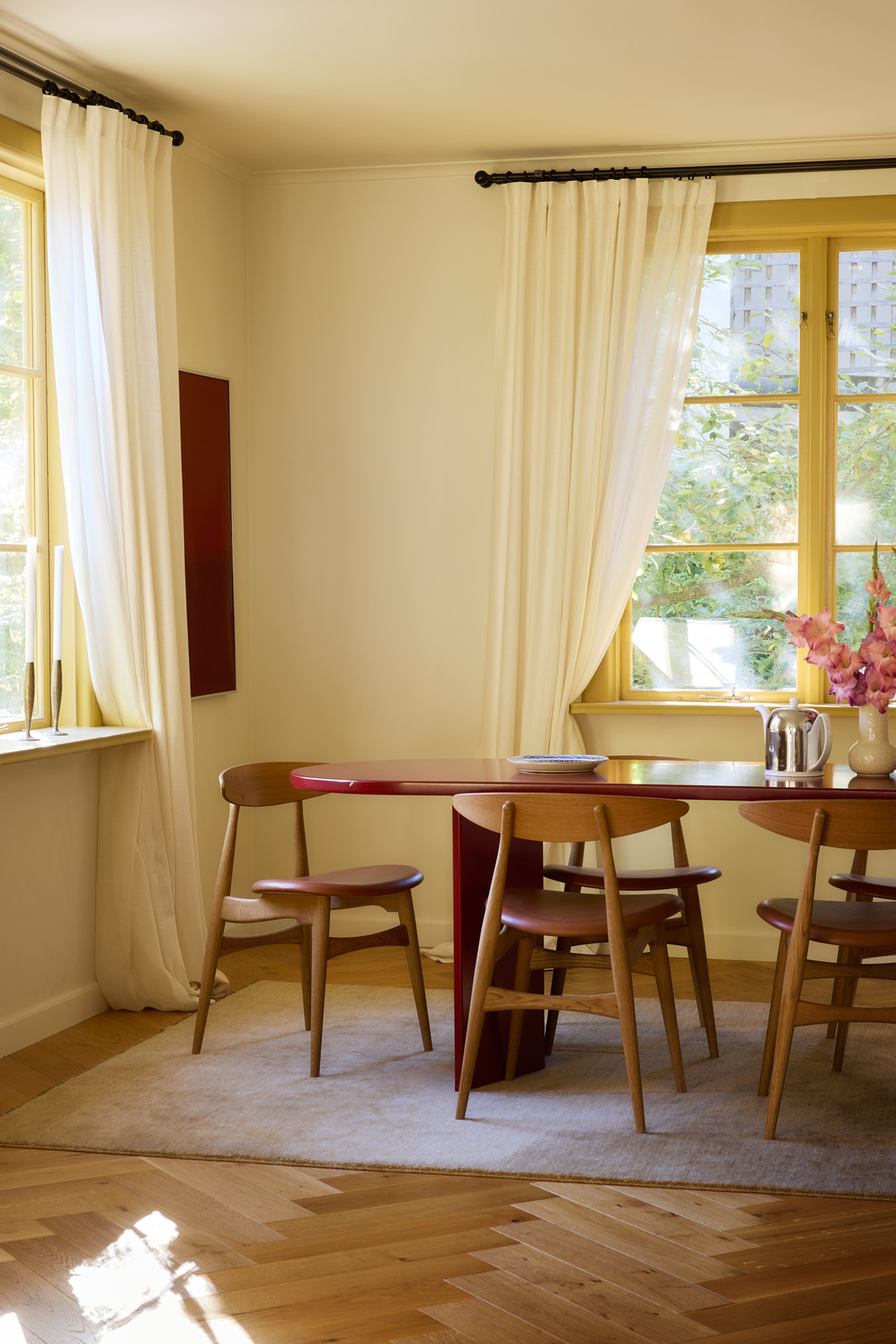For Julia, textiles have been as important as any other material choice in the kitchen. Strong colors are balanced by neutral curtains in soft off-white tones. In the kitchen’s cooking area, she’s chosen a Roman shade in a woven linen, while in the social dining area, the same textile reappears as full-length curtains. To create a warm and inviting ambiance, Julia has layered curtains on black rods, adding a subtle yet impactful depth to the space. The woven off-white linen is paired with sheer linen curtains in the same hue, and a gentle drape grounds the look, adding sophistication. The red accents in the built-in bench are echoed in the dining table, also custom-designed by Julia, surrounded by warm-toned wooden chairs.
