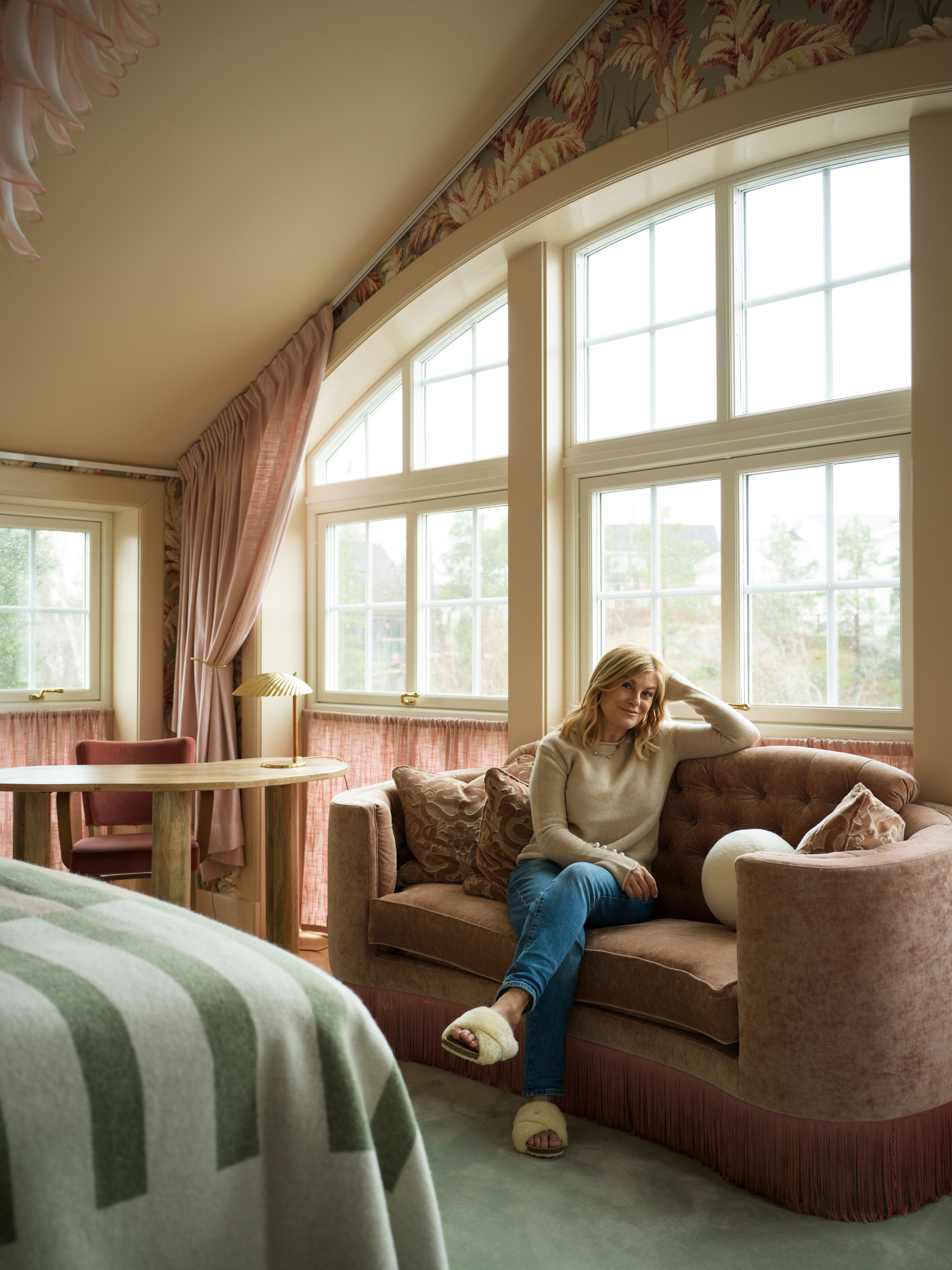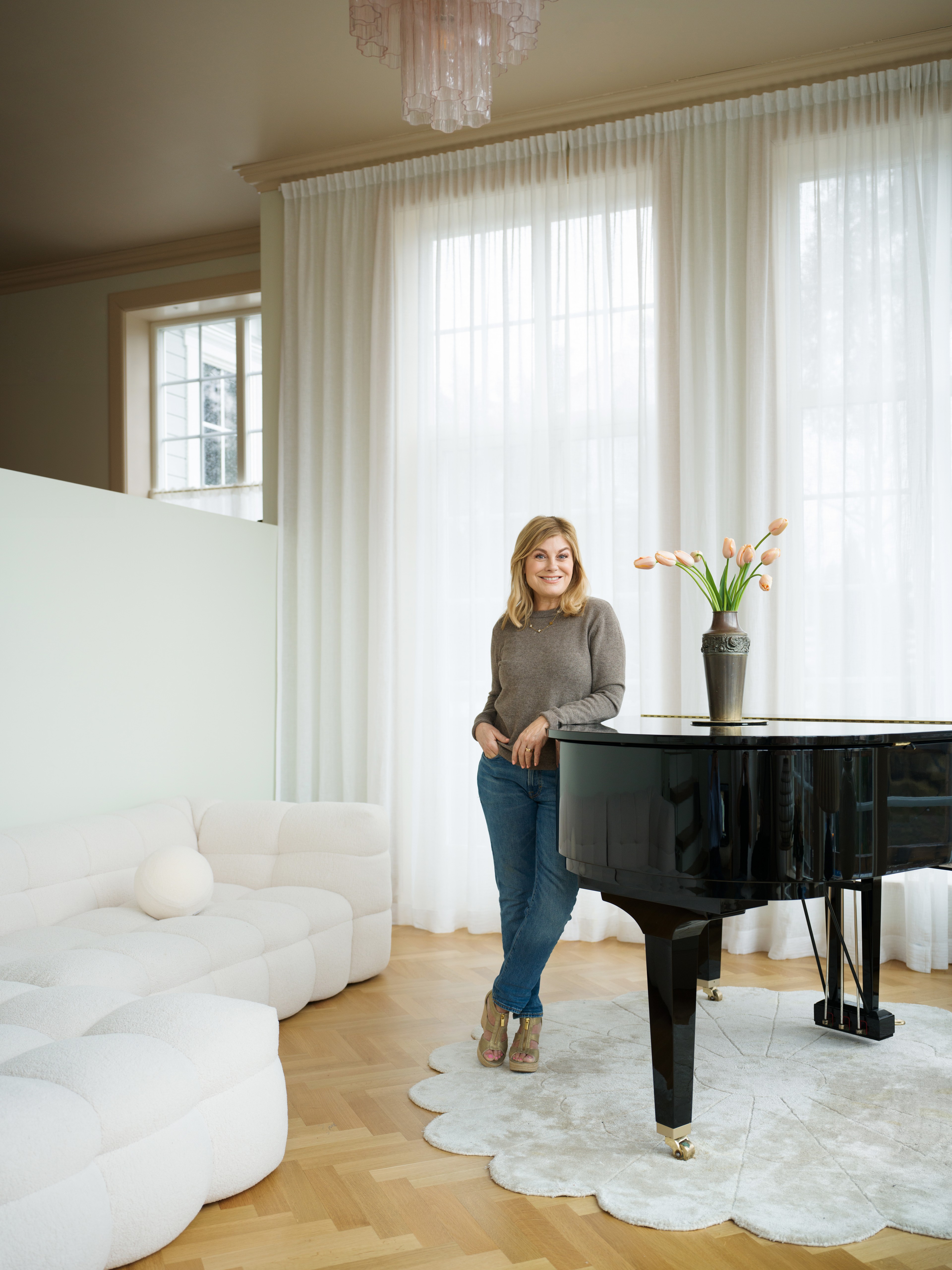 Pernilla Wahlgren’s home is a true reflection of her personality and warmth, and the colorful decor conveyed through a palette of pastels, such as pink and turquoise, has almost become her signature. Pernilla shares this home with her husband Christian, her son Theo, and a big food-loving family that is more than happy to visit. In the spacious living room every detail is carefully selected to create a feeling of space and openness. The extra long, sheer linen curtains that frame the impressive windows create an airy feeling, while at the same time adding warmth to the room. The grand windows might be what is mostly associated with this well-noted home, and here the possibility to shield yourself from the rays of sunlight is essential in order to not live in a greenhouse during the warm months of the year.