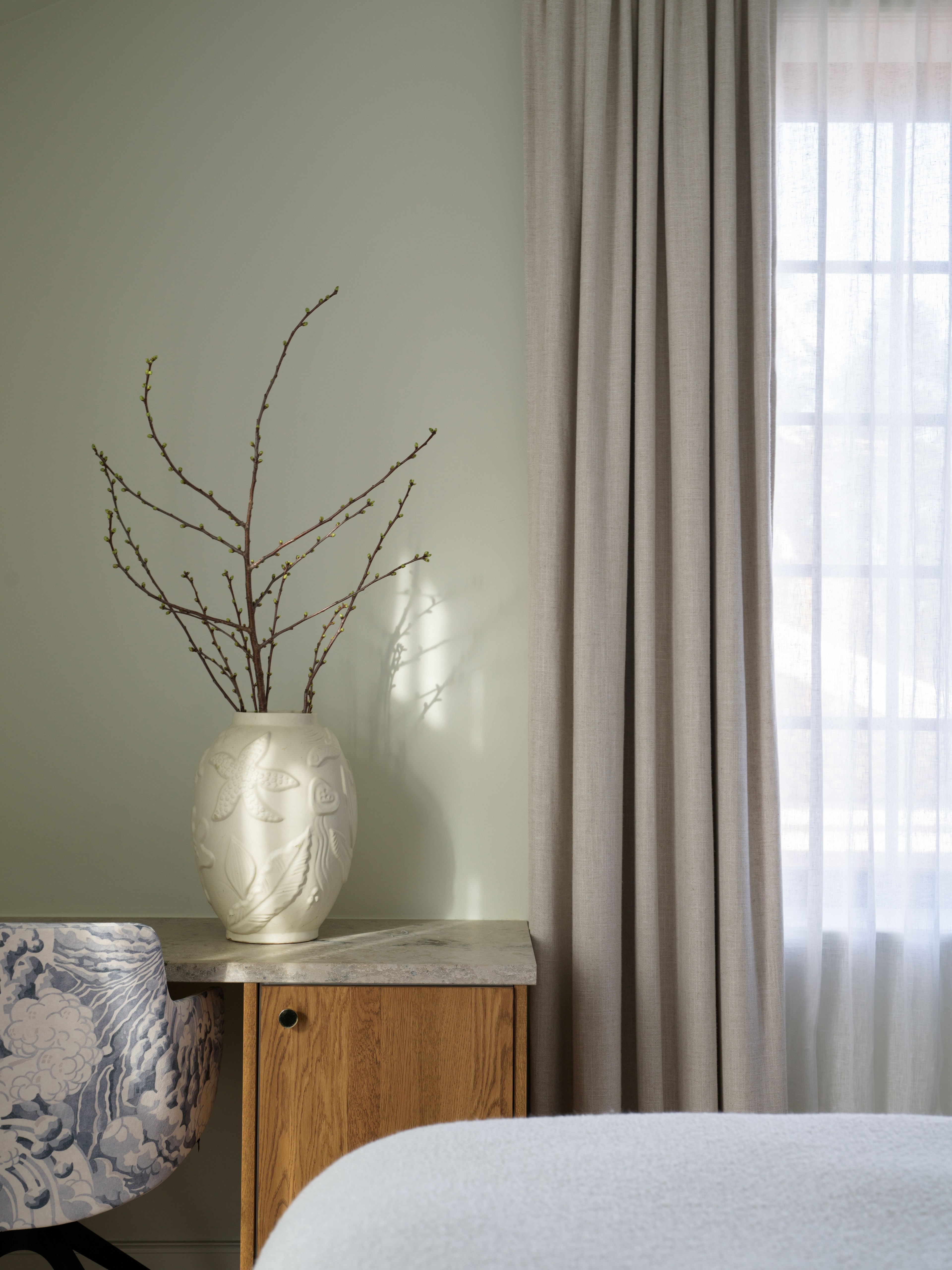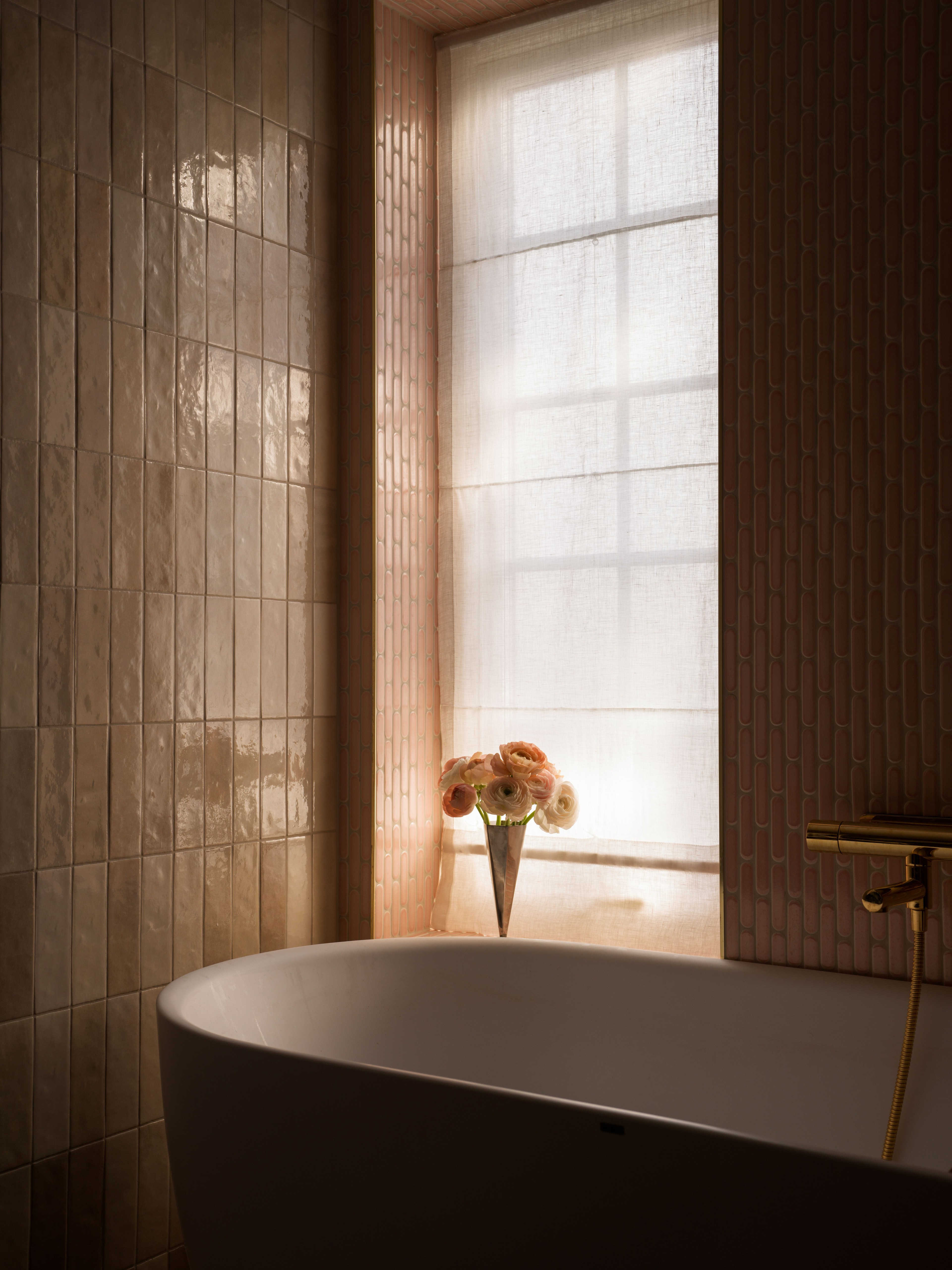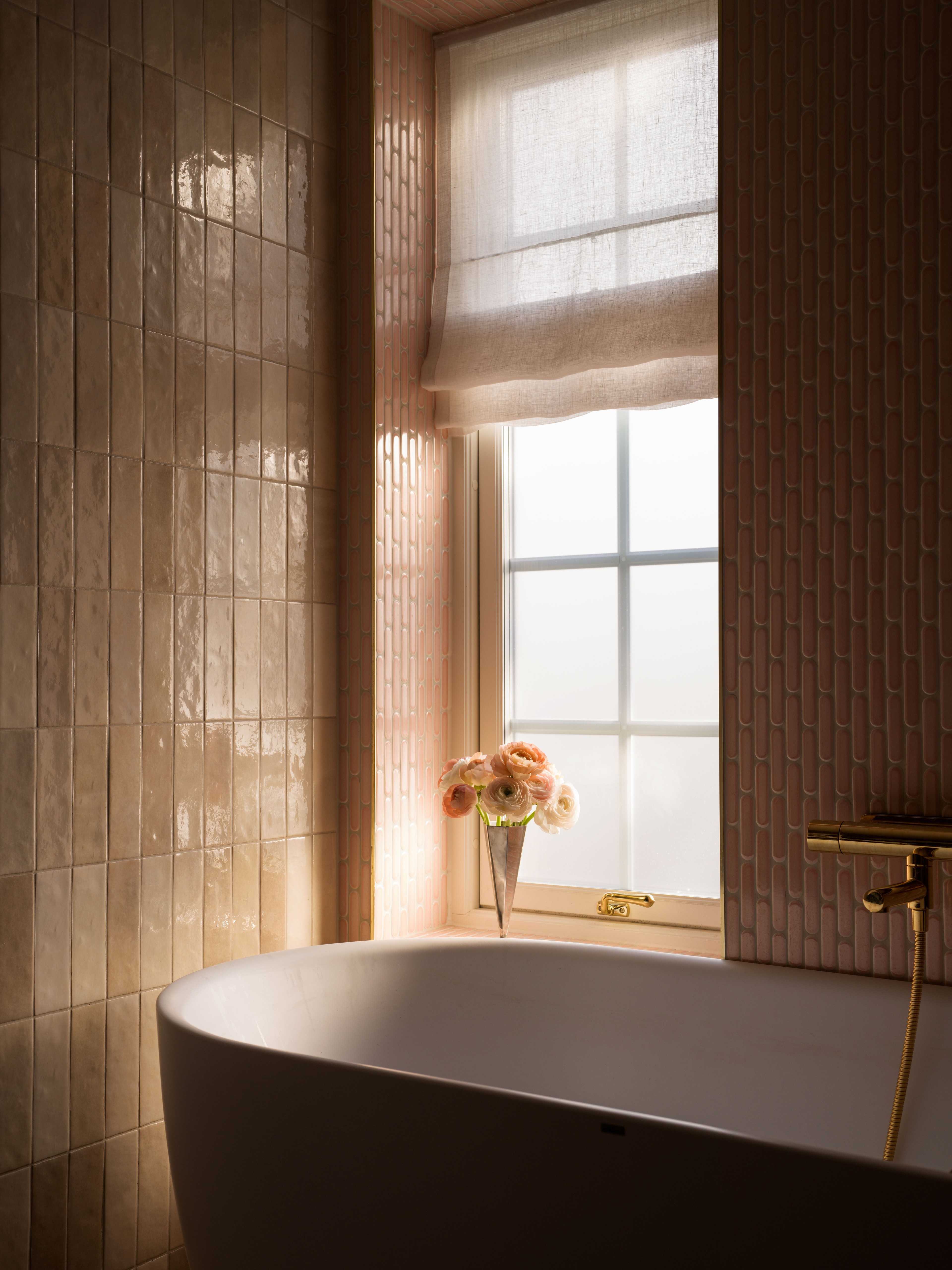 In the pink ensuite bathroom the window has been draped with a roman blind in sheer linen that filters the soft daylight. The walls are dressed in pink tiles with an organic feeling, the texture makes it reminiscent of Zelliege-tiles and brings your mind to a Moroccan Medina, but with a Scandinavian twist. Instead of competing for attention, the colorful tiles and the soft roman blind complete each other in a way that amplifies every element of the room. As the window does not have a frame and is tiled like the rest of the room, Pernilla has chosen to place the blind in the window niche, which additionally enhances the feeling of the blind being one with the space.