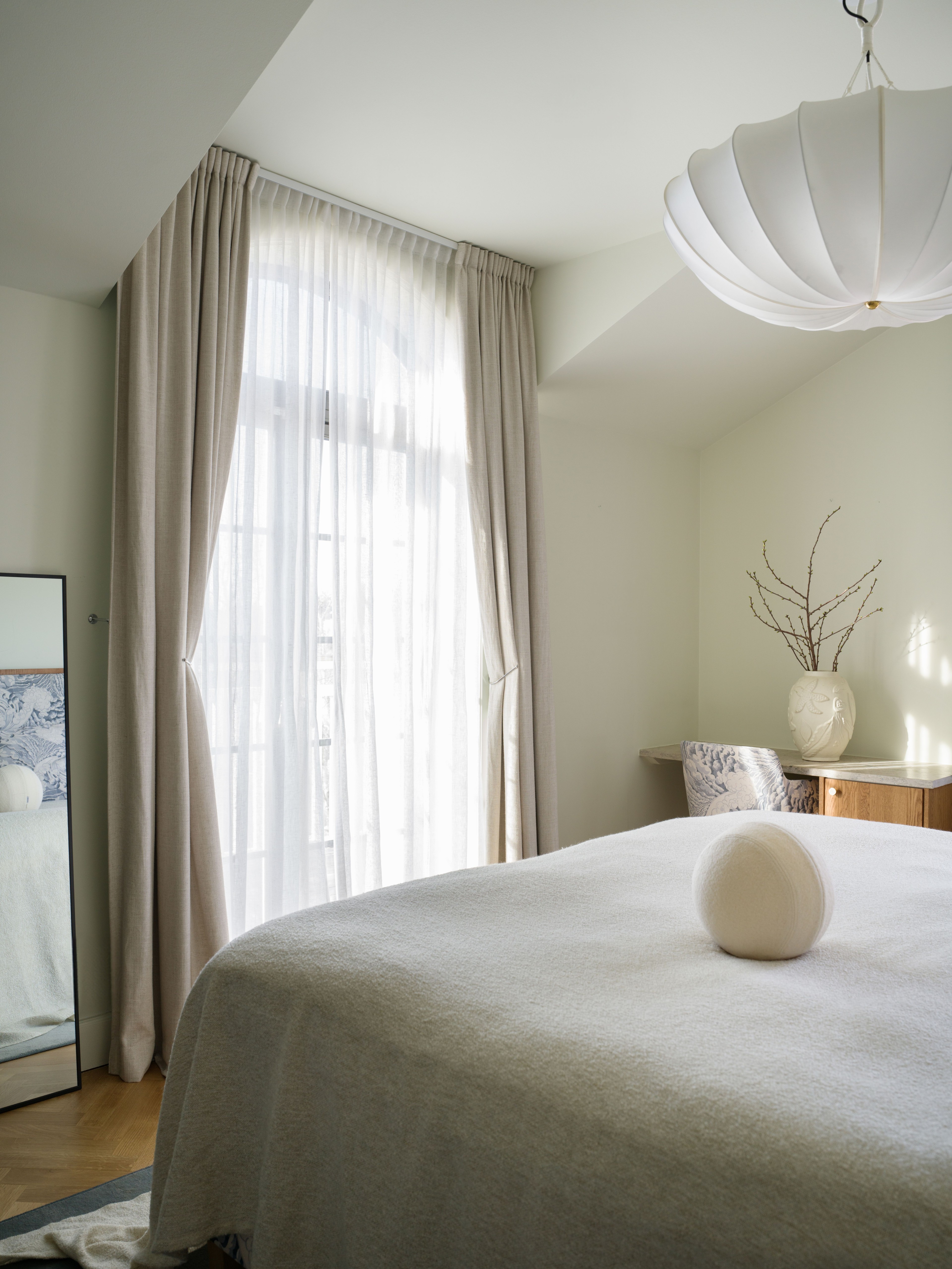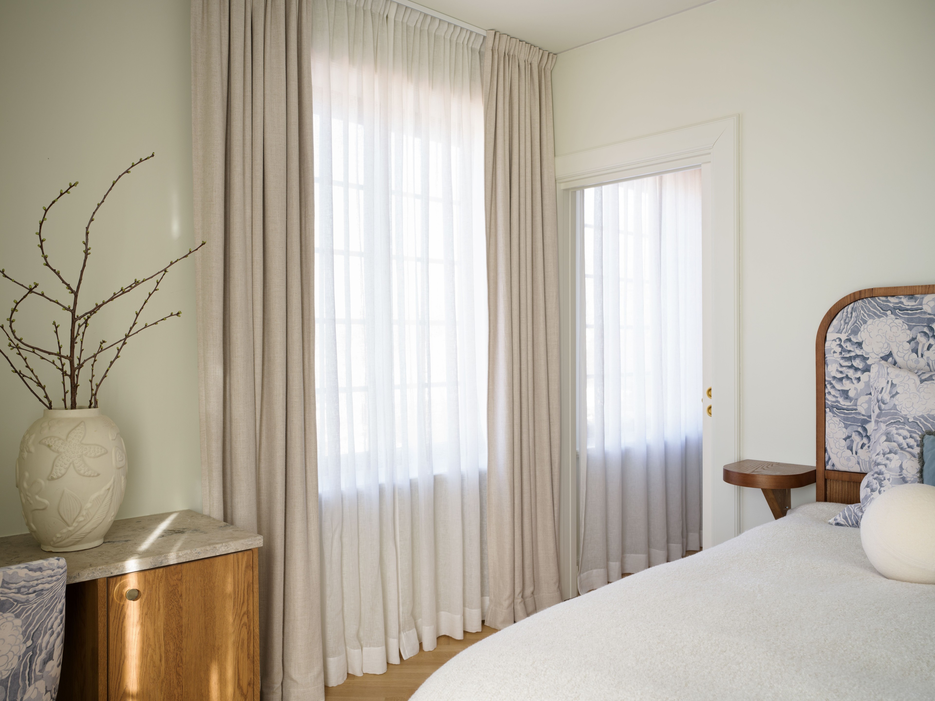 Her son Theo’s room is the only one in the house that does not have pink as an accent, instead we find a tranquil blue color that sets the tone of the decor. Even in this room we find an impressive amount of windows that contribute to an amazing light, all dressed in the same curtain combination of sheer linen and blackout woven linen.