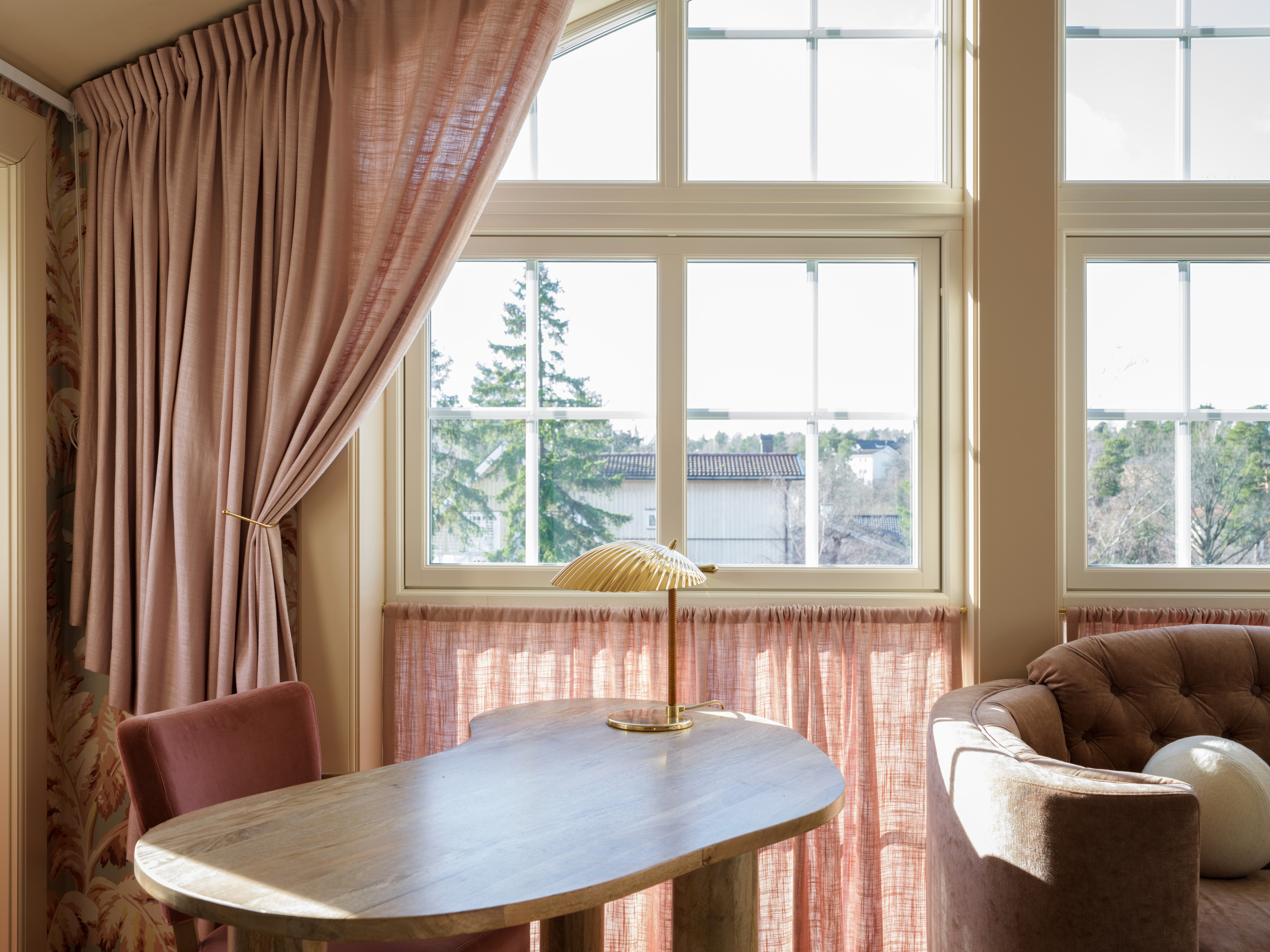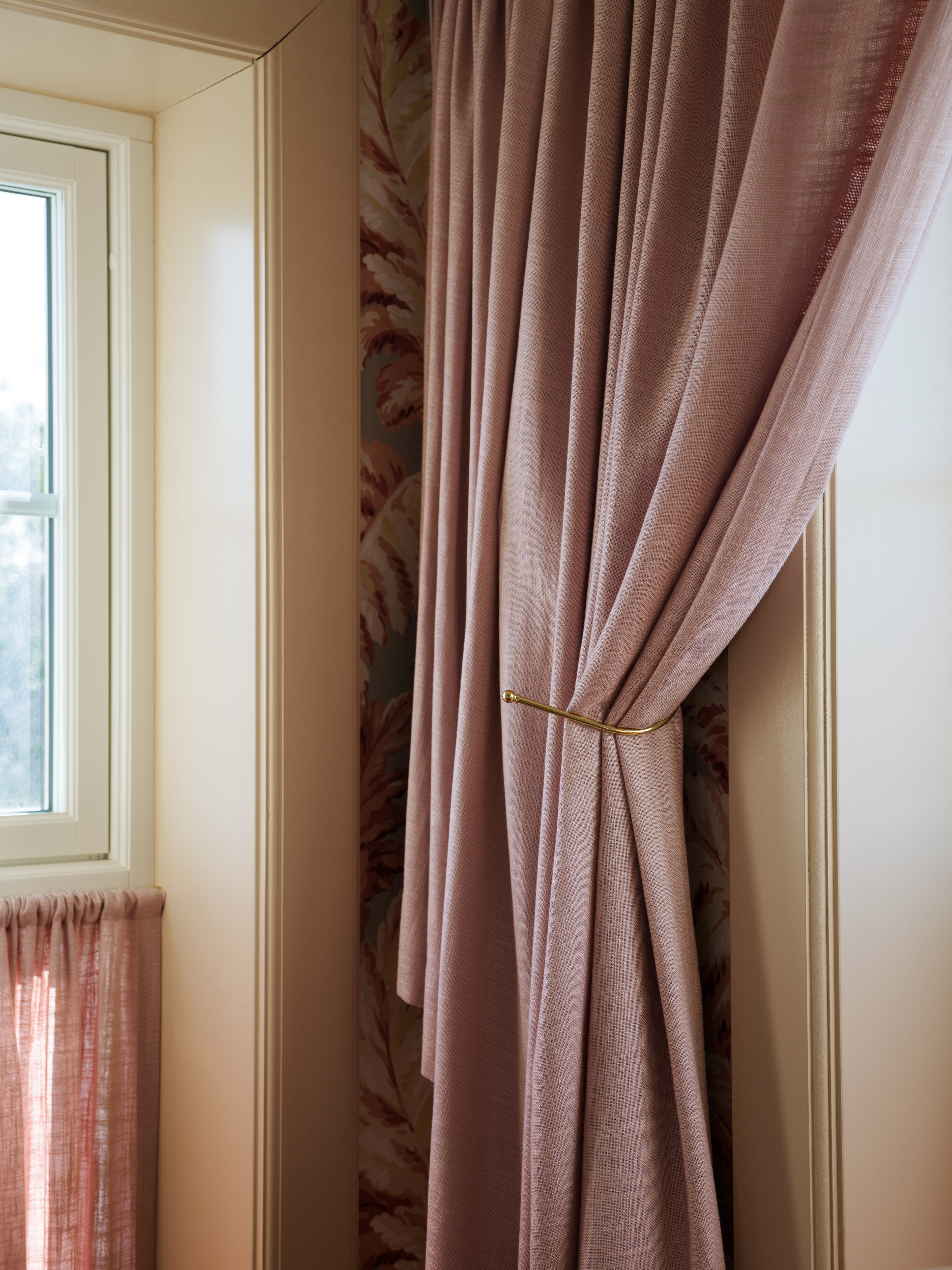 In the bedroom your eyes are immediately drawn to the arched windows that stretch all the way up to the ridge roof. The windows, which are full of character, are not only an appreciated source of natural light; they are also an architectural element that demand a bespoke curtain solution, to create balance between privacy protection and intimacy. Here you can find café curtains in pink woven linen, together with a customized curtain solution fitted to Pernilla’s slanted windows, in the same textile. To avoid the curtains stealing any much light during daytime, they are gathered in brass curtain tie-backs, a detail that adds both function and form.