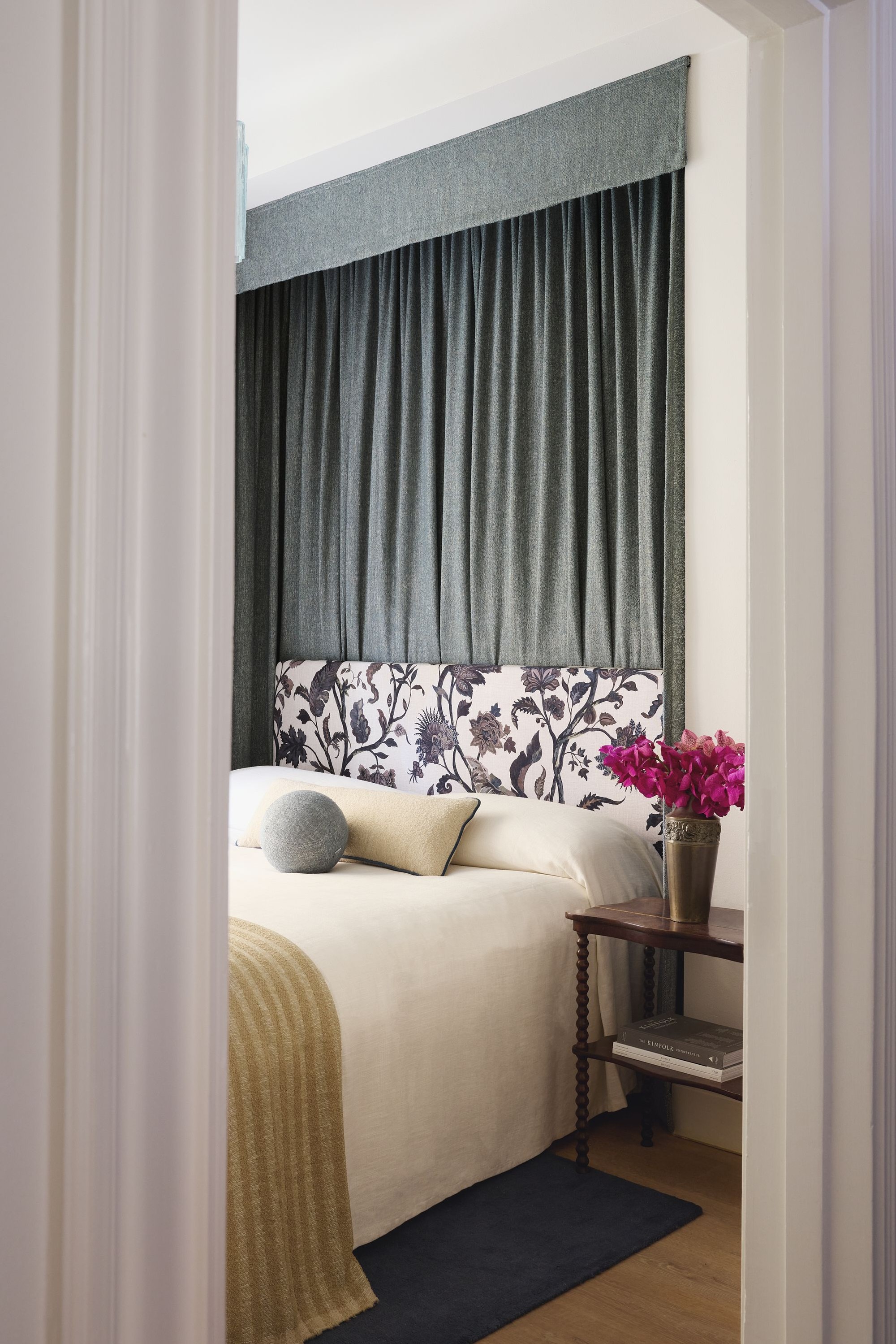 - Curtain lengths in Bouclé Petroleum.