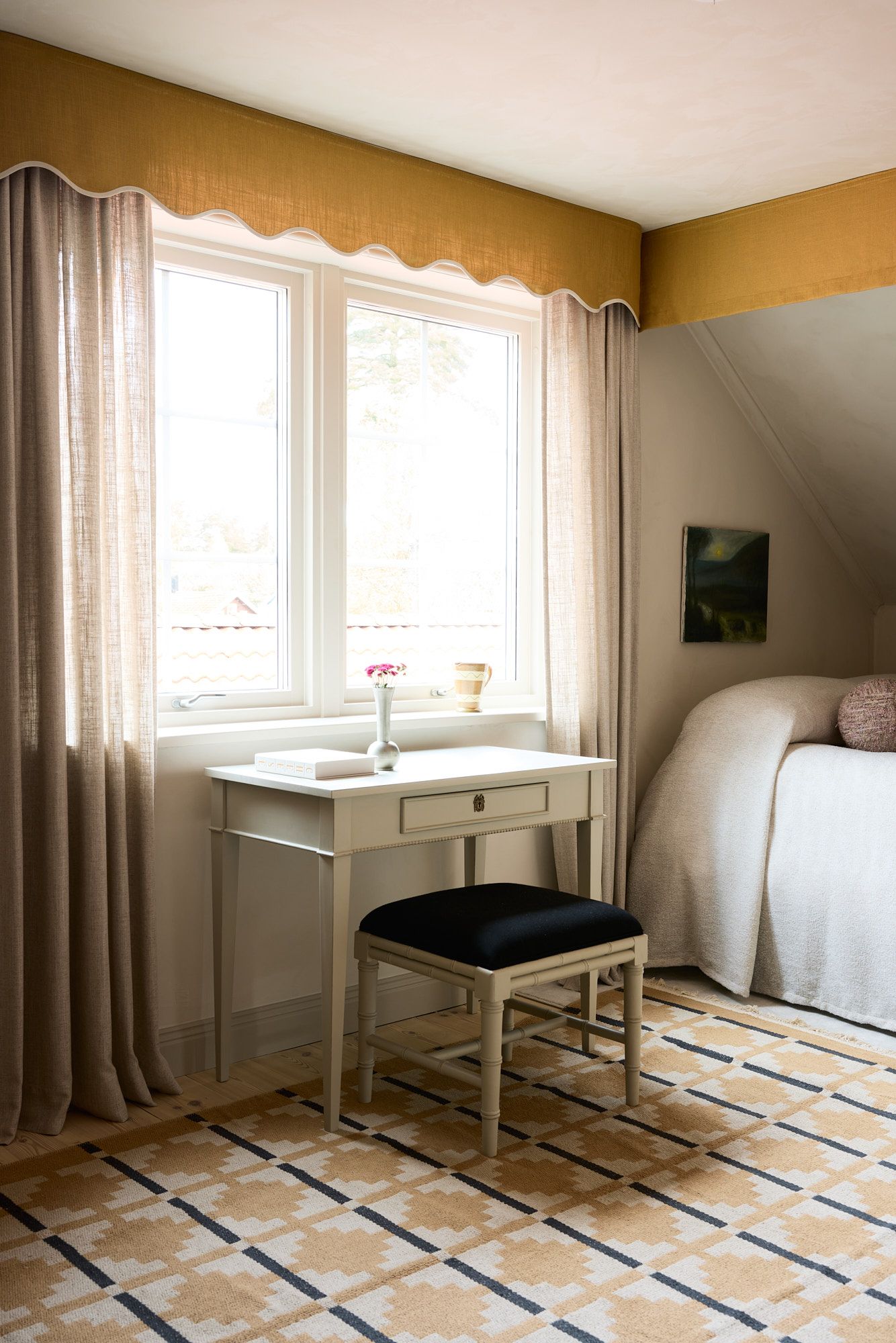 - Curtain Valance Scallop Edge mustard with a curved finish.