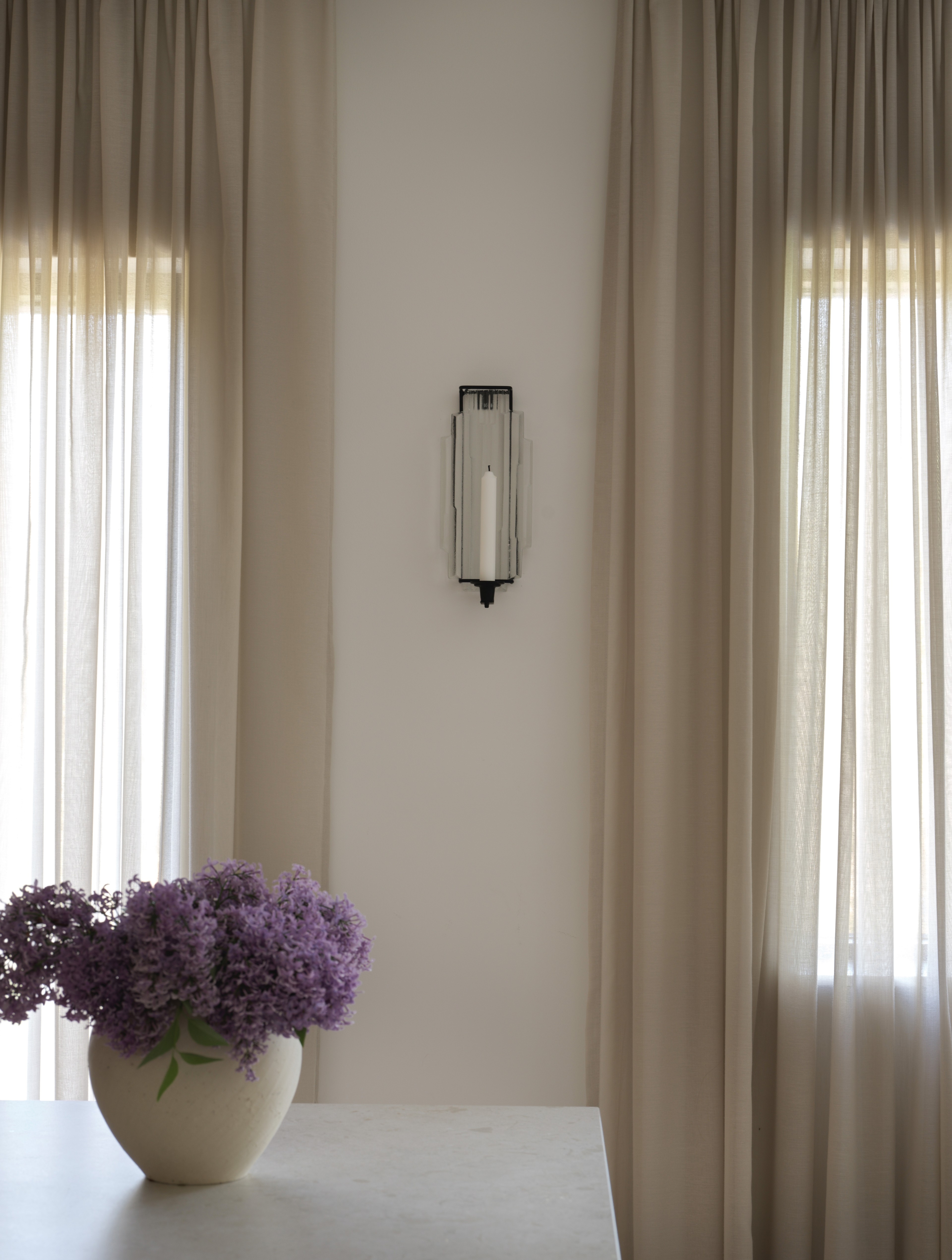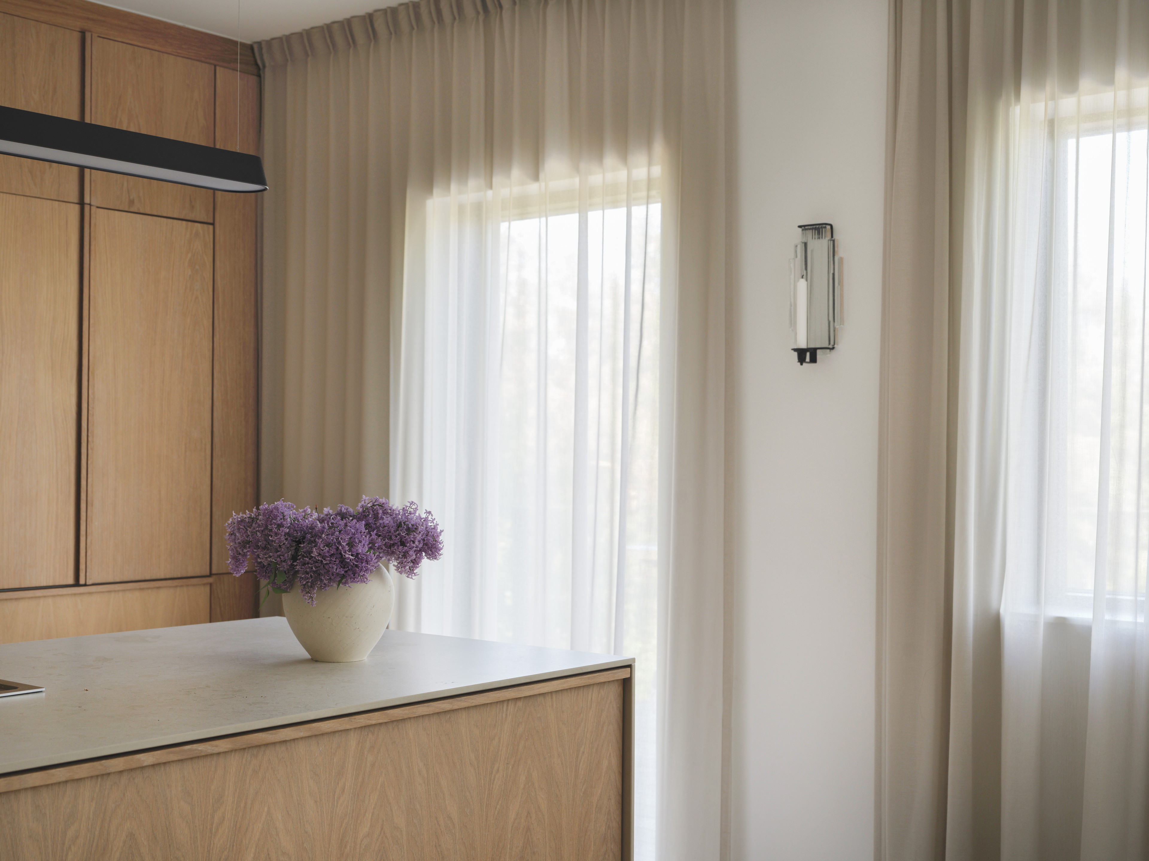By letting the hotel voile curtains be continuous from the living room to the kitchen is a simple detail, but makes all the difference in connecting the rooms in a harmonious way. Here even the corner is draped in textile, to create a seamless feeling between the rooms. Through the kitchen windows we get a glimpse of a massive terrace, and Emelie floats like a late summer dream through the curtains to pick lilacs from the bushes growing outside.