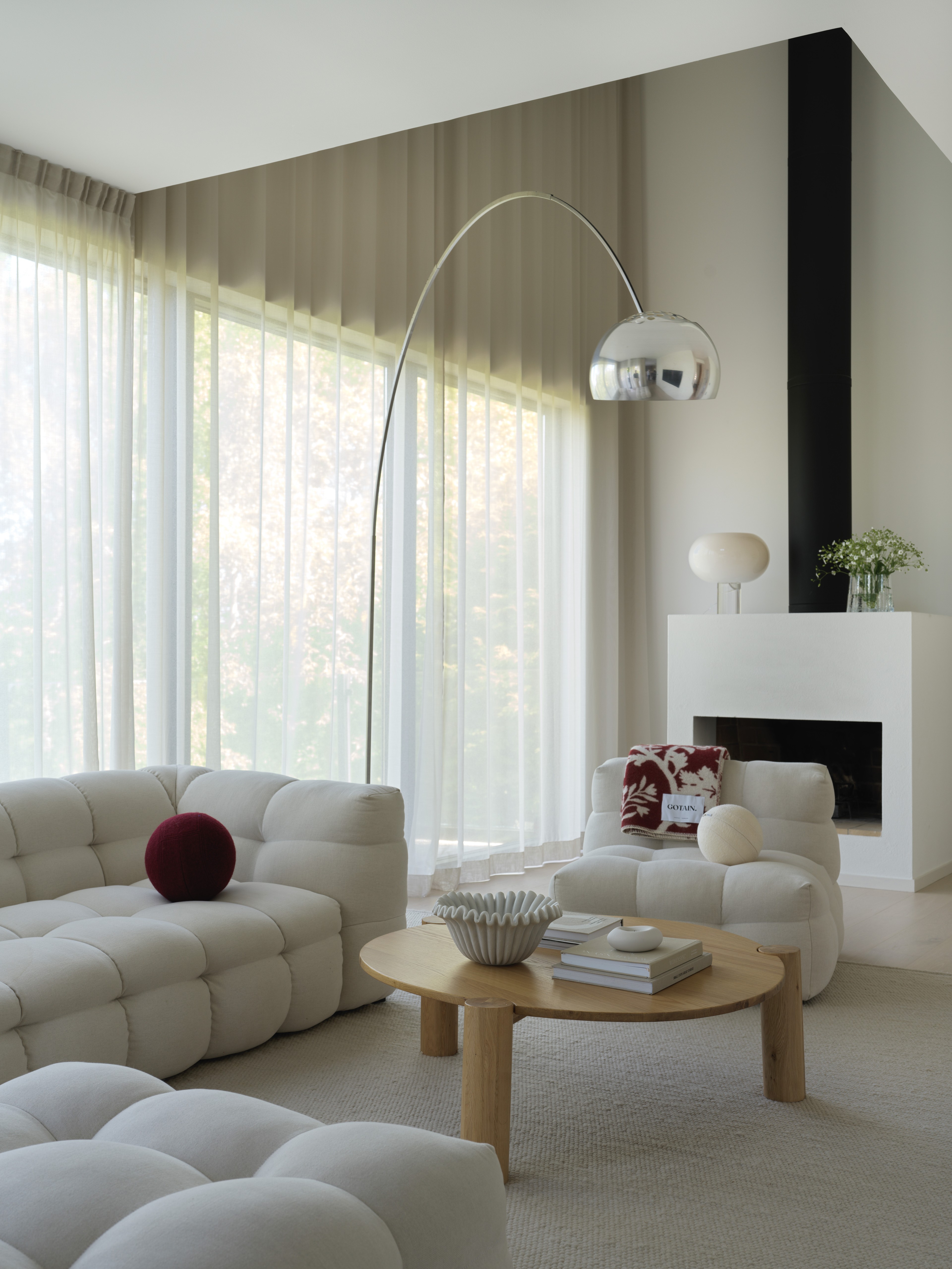 When crossing the threshold of the modern villa there’s no doubt that the living room is the crowning jewel of the house, with its double floor ceiling height and grand glass sections that let us get a feeling of the forest on the other side. An open fireplace in the corner makes this the family’s favorite place, regardless season, and the sheer hotel voile curtains that cover every inch of the wall make the generous windows feel soft and warm. The previous owner of the house let the tracks run along the top of the windows, but Emelie and her partner Sonny decided to to move the tracks all the way up to the ceiling to enhance the spacious feeling of the room.