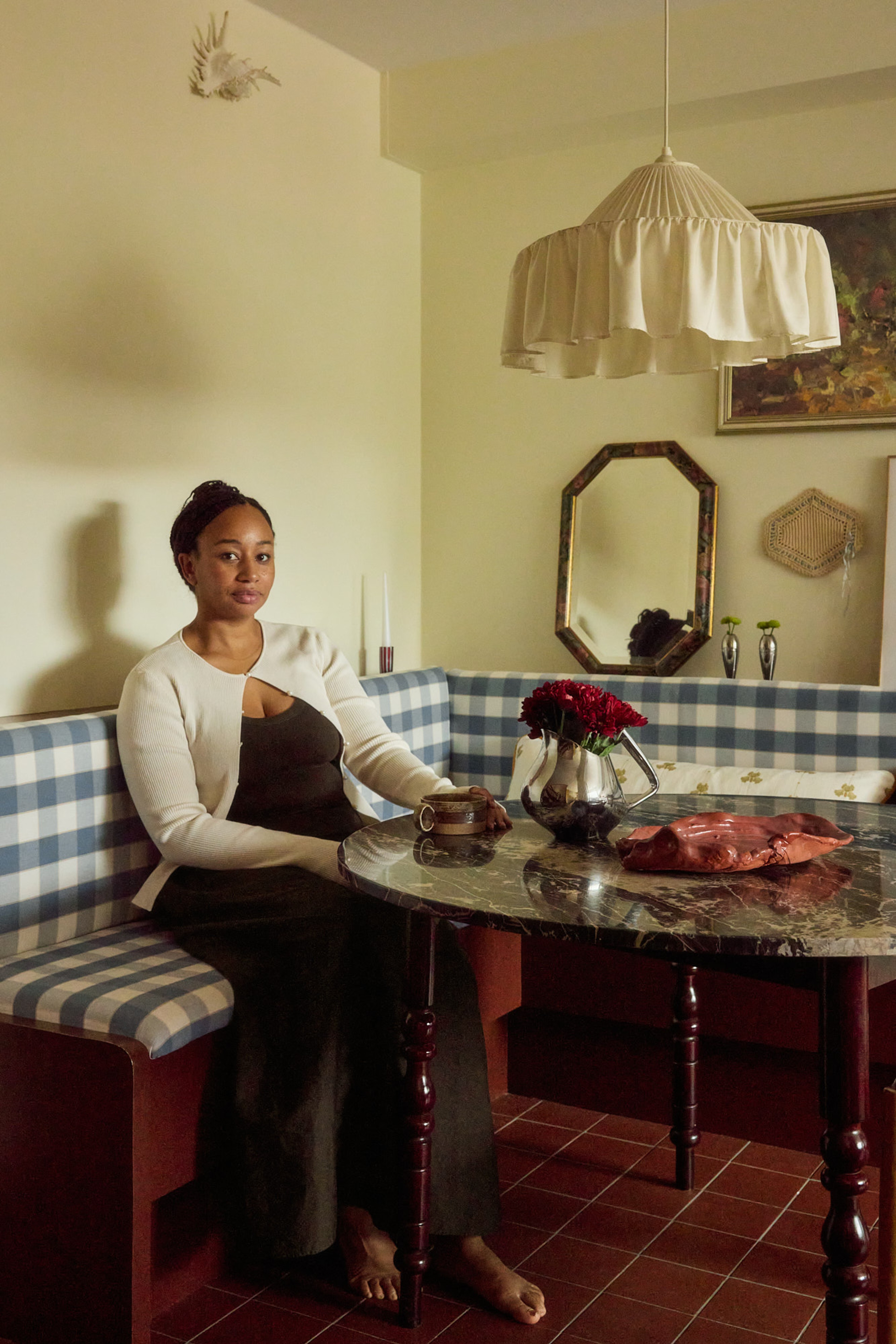 One of Marion’s favourite corners of the house is the living room area facing the terrace, where green curtains meet a blue ceiling and a burgundy-coloured floor. The interplay between colour and textile creates a warm and playful expression, while the room retains its sense of weight and balance.