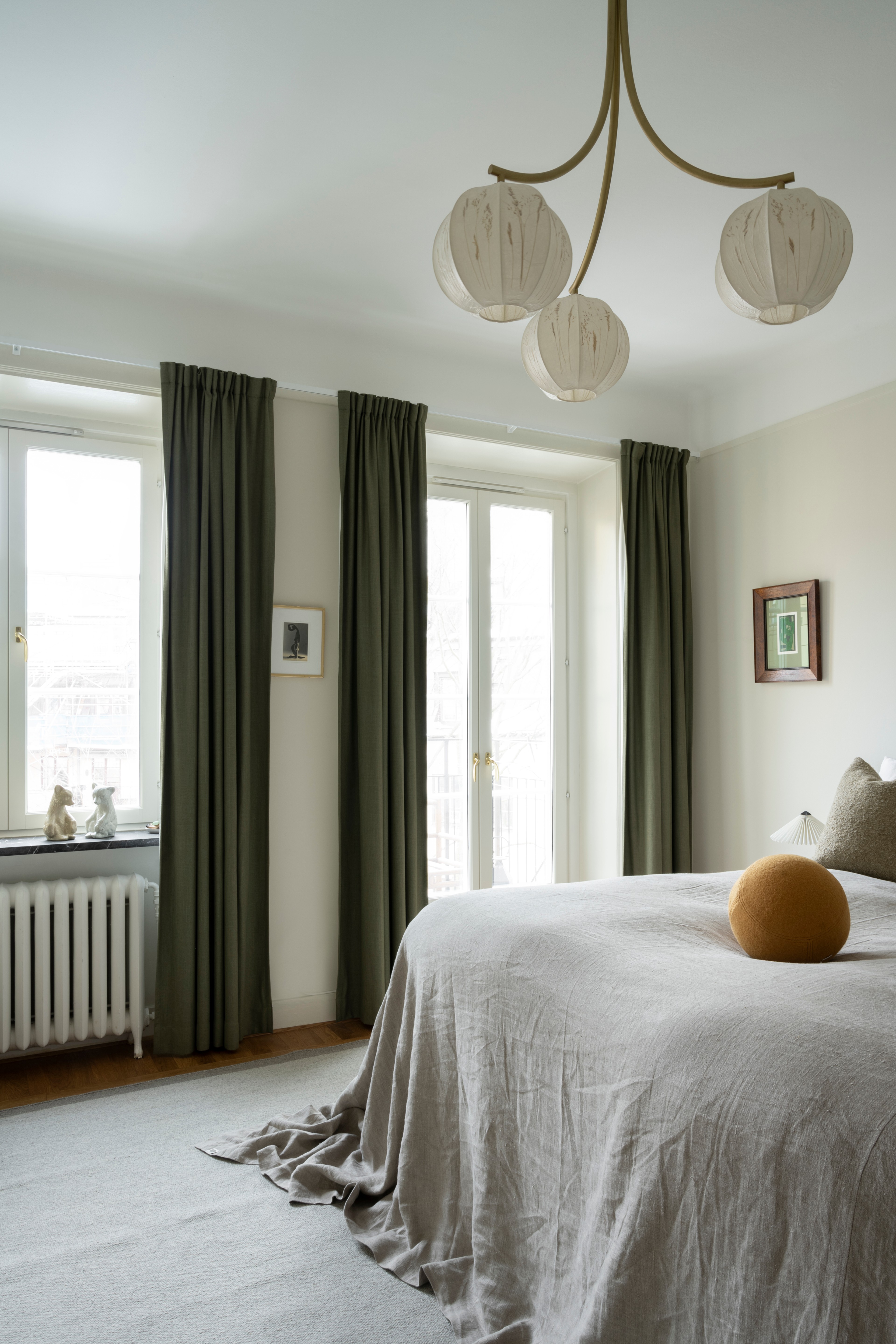 In the bedroom we participated in great debates regarding the color of the black out curtains last time we were here, where team Gotain unanimously voted for the color Khaki. Michaela was also feeling it, but was at the same time hesitant that the color might be too dark. Today we can see that it turned out just as beautiful as we had imagined it, and thank god Michaela and Andreas both agree!